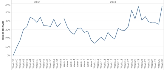 Nombre de tests réalisés : 10,116* +33 en 24h, précédent +58 en 24h Taux de positivité (moyen depuis le débit de l’épidémie) : 35,70%, précédent 35,69% *La baisse observé sur le graphique pour les semaines 25 à 30 est le résutat de l’absence fréquente de plusieurs jours sans actualisation des données par le laboratoire. Évolution hebdomadaire du taux de positivité (semaine 29) :