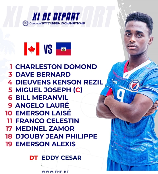 Jeudi 10 août 2023 en 1/4 de finale éliminatoire du Championnat masculin de la U-15 de la Confédération de l'Amérique du Nord, de l'Amérique Centrale et des Caraïbes (CONCACAF) nos jeunes Grenadiers U-15 (ligue A), affrontaient «Les Rouges» du Canada (donnés favori) sur la pelouse du Stade Olympique Felix Sanchez, à Santo Domingo en République Dominicaine. Tout au long du match, les joueurs d’Eddy César ont su vaillamment résister aux assauts des Canadiens qui ont assez largement dominé le jeu, mais qui n’ont pas réussi à faire trembler les filets de Charleston Domond. Nos Grenadiers se sont montré à plusieurs reprises très dangereux sur leurs attaques. En fin de première période le score était toujours de [0-0] Au retour des vestiaires nos Grenadiers se sont créés plusieurs occasions sans pouvoir les concrétiser, il a fallu attendre la 55’ pour que Bill Meranvil ouvre le score pour Haïti sur une passe de Franco Celestin[1-0], avec un tir imparable à l’entrée de la surface de réparation qui laisse le portier Canadien sans réaction. Score inchangé au terme du match. Grâce au but inscrit par Bill Meranvil nos Grenadiers (double champion de la CFU Challenge series 2021 et 2022) se sont offert le Canada et se sont qualifiés pour les demi-finales où ils affronterons les États-Unis victorieux du Guatemala [4-1]. États Unis qui avaient remporté la victoire en phase de poule contre Haïti [3-0] https://www.haitilibre.com/article-40211-haiti-flash-humilie-par-les-usa-[3-0]-haiti-reste-qualifie-pour-les-1-4-de-finale.html sur un terrain détrempé par les pluies abondantes a peine praticable du Stade panaméricain de San Cristóbal qui a considérablement handicapé le jeux de nos Grenadiers. L’heure de la revanche est venue, Grenadiers à l’assaut ! Onze de départ : Pour ce /4 de finale, par rapport aux deux dernières sorties face au Qatar et les États-Unis, l’entraineur Eddy César n’a opéré qu’un seul changement, il s’agit du buteur de la victoire (1-0) face au Qatar, Angelo Lauré, récompensé d’une titularisation en attaque, en remplacement de Jackson Saintinord.