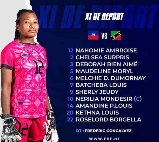 Pour le match retour face à St kitts & Nevis le sélectionneur Frédéric Gonçalvez a annoncé un onze de départ quasi identique à celui du match aller remporté [11-0] par Haïti. Seul changement, Nahomie Ambroise, titulaire face à Costa Rica [1-0] en septembre, est de retour dans la cage.