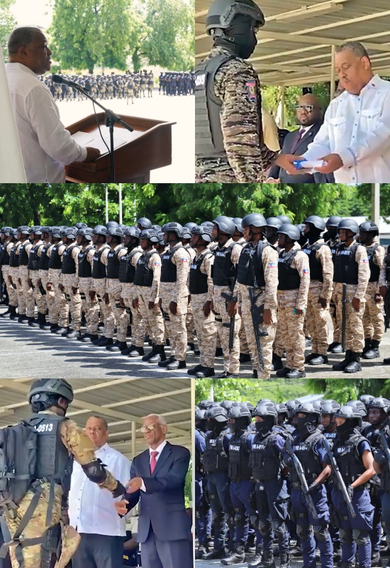 Mardi 18 juin 2024, sur l'esplanade de l'École Nationale de Police (ENP), située à la Route de Frères, Commune de Pétion-Ville. a eu lieu la cérémonie de de remise de parchemins à 455 nouveaux policiers des forces spécialisées de la Police Nationale d’Haïti (PNH). Cette cérémonie s'est déroulée en présence d’Edgard Leblanc Fils, Président du Conseil Présidentiel de Transition (CPT), accompagné du Conseiller Smith Augustin, du Premier Ministre Garry Conille, du Ministre de la Justice, Me Carlos Hercule, du Directeur Général de la Police Nationale, Frantz Elbé [ révoqué mais toujours en poste [?] https://www.haitilibre.com/article-42555-haiti-flash-frantz-elbe-dg-de-la-pnhrevoque-remplace-par-un-ex-dg-revoque.html ] et des membres du Corps diplomatique, entre autres… Issus majoritairement de la 33e promotion de la PNH, ces récipiendaires viennent d’achever avec succès durant 3 mois d’une formation intense et adaptée pour leur intégration aux unités spécialisées de la PNH, notamment la BRI, le SWAT, l'UTAG, la PoliFRONT, le CIMO, la BOID, la BLVV et l'UDMO. Dans son intervention de circonstance, le Chef du Gouvernement a déclaré. « Vous devez savoir que vous n’êtes pas seuls. Vous êtes l’espoir de la population dans ce moment crucial de son histoire. Nous apprécions vos efforts immenses, vos sacrifices et les loyaux services rendus à la population haïtienne […] Ensemble, nous allons reconquérir nos villes et nos espaces publics et assurer la libre circulation des vies et des biens […] Le moment est venu de revoir notre approche de la sécurité et de reconsidérer notre stratégie pour qu’elle soit globale et immédiate. »