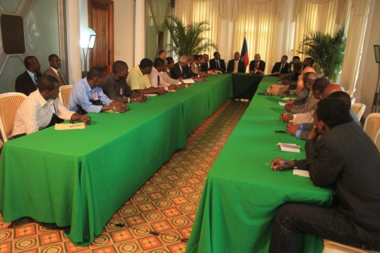 Michel Martelly, le Président de la République, accompagné du Premier Ministre Garry Conille, de quelques membres du gouvernement et du parlement haïtien, a rencontré ce jeudi, au Palais National, la plus haute instance de l'Université d'État d'Haïti (UEH) et un groupe d'étudiants représentant les différentes entités de l'UEH. Le Chef de l'État, par cette réunion, entame le processus d'encadrement et de renforcement de l'Université d'État d'Haïti, l'une de ses promesses de campagne. Au cours de cette longue discussion avec les autorités de l'UEH, divers points ont été débattus, tels que l'état des lieux de la formation à l'UEH, son importance dans le développement du pays, l'intégration des jeunes gradués dans l'administration publique, l'implication directe de l'université dans les grandes décisions en faveur du changement, la capacité d'accueil de l'institution, etc... « L'Université arrive de moins en moins à jouer son rôle », a indiqué Jean Henry Vernet, Recteur de l'UEH qui, tout en félicitant le Président Martelly pour cette noble initiative, croit nécessaire d'établir un cadre formel de coopération avec les institutions de l'État et de mettre en place un groupe de travail tripartite Gouvernement/Parlement/UEH. Le Président de la République, tout en leur promettant son soutien, invite les responsables de l'institution à se mettre au travail en vue d'établir les nouvelles bases d'une université d'État, avec son propre campus, un curriculum moderne répondant aux exigences de développement, et un professorat qualifié.