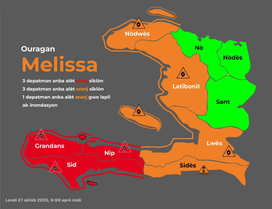 Mardi 28 octobre 2025, dans son dernier bulletin à 5h00 a.m. heure avancée de l’Est (0900 UTC), la National Oceanic and Atmospheric Administration (NOAA), le centre de l’ouragan Melissa de catégorie 5 a été localisé à 17,2 degrés de latitude Nord et 77,8 degrés de longitude Ouest avec des vents maximum soutenus de 280 km/h avec des rafales plus élevées (pression centrale minimale 901 millibar). Melissa est situé à 640km au Sud-Ouest de Port-au-Prince. Melissa se déplace lentement vers l’Ouest à près de 5 mph (7 km/h). Un virage vers le Nord-Est avec une augmentation de la vitesse de déplacement est attendu plus tard aujourd’hui, suivi d’un mouvement plus rapide vers le Nord-Est mercredi et jeudi. Sur la trajectoire prévue, le cœur de Melissa devrait se déplacer sur la Jamaïque aujourd’hui, traverser le Sud-Est de Cuba mercredi matin, et traverser le Sud-Est ou le centre des Bahamas plus tard mercredi. Des conditions de tempête tropicale sont attendues tard mardi et mercredi sur les côtes Ouest d’Haïti. Notez que les vents de force tempête tropicale s’étendent jusqu’à 195 miles (315 km) du centre de Melissa. Des inondations éclair et des glissements de terrain catastrophiques et potentiellement mortels sont attendus dans le Sud-Ouest d’Haïti. Des dommages importants aux infrastructures et l’isolement des communautés sont probables. L’Unité Hydro Météorologique d’Haïti (UHM) de concert avec la Direction Générale de la Protection Civile et le Secrétariat permanent à la gestion des risques maintien en vigilance rouge les départements du Sud, de la Grande Anse et des Nippes. Les département du Sud-Est, de l’Ouest, de l’Artibonite et du Nord Ouest sont en vigilance orange.