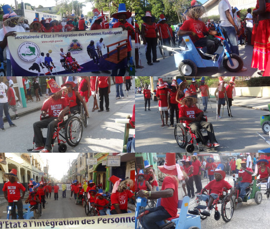 Le Bureau du Secrétaire d’Etat à l’Intégration des Personnes Handicapées (BSEIPH) et son bureau régional du Sud, nous informe, qu’à l’initiative du Bureau, les personnes vivant avec un handicap, ont également pris part au défilé du Carnaval National 2012 qui se tenait au Cayes du 19 au 21 février derniers. « L’objectif était de profiter de ce grand rassemblement populaire pour mieux sensibiliser la population à l’intégration des personnes handicapées, dans la vie de tous les jours » a précisé le Secrétaire d’État Gérald Oriol Jr. « Le carnaval est une grande fête à laquelle participent les jeunes, les personnes âgées, tout le monde. Dans un contexte d’intégration, il était important que les personnes handicapées soient aussi présentes [...] il s’agissait également de montrer à la population que ce sont des personnes à part entière. » Ainsi des unijambistes, des hémiplégiques, des personnes vivant avec une déficience visuelle ou intellectuelle, certaines en chaises roulantes, d’autres munies de leurs béquilles, ont défilé aux Cayes au cri « Inclusion Oui, Exclusion Non ». Les personnes handicapées ont fait un véritable show tout au long du défilé, tels que des jeux d’animation, des courses, des jeux de ballon et d’exhibition. La prestation d’une non-voyante au jeu de ballon a été particulièrement appréciée.