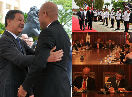 Le Président Michel Martelly, au terme de sa visite en République Dominicaine, ce lundi 26 Mars, a signé avec son homologue dominicain Leonel Fernández, une Déclaration Conjointe visant à renforcer les relations de bon voisinage entre les deux peuples. « La géographie nous commande de cultiver le vivre ensemble pour le bien-être de nos populations respectives » a fait valoir le Président Martelly. La signature de ce document permettra aux deux Chefs d’Etat d’apporter leur soutien absolu à la Commission Mixte Bilatérale Haïtiano-Dominicaine, comme mécanisme fondamental pour le dialogue entre les deux Etats et pour impulser la coopération au bénéfice du développement mutuel. Le Président Martelly et son homologue dominicain assument que les questions migratoires, souvent complexes, méritent une solution appropriée au bénéfice des deux États; et réaffirment leur engagement à une politique de frontière sûre et sans obstacles aux échanges entre les deux pays. « Ces relations, malgré des soubresauts qui peuvent être considérés comme des querelles de famille, ont amplement donné leur mesure de solidarité », a affirmé le Président Martelly.