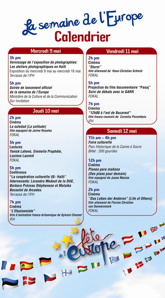 La semaine de l'Europe en Haïti, qui se déroulera, du 9 au 12 mai 2012, est organisée par la Délégation de l'Union européenne en Haïti en partenariat avec les ambassades d'Allemagne, d'Espagne et de France, les consulats de la Slovaquie et de la Lettonie, ainsi que le Ministère de la Culture et de la Communication, FOKAL, l'Institut Français en Haïti, Tamise et le programme Culture Arcades. À cette occasion de nombreuses activités sont prévues : littérature, exposition de photos, musique, projection de films, conférences... ainsi que divers événements d’envergures diverses, dans les villes et dans les écoles du pays, à l’initiative des associations, des enseignants et des collectivités locales. Rappelons que l'Union européenne fournit un appui important au développement et au renforcement économique et social d'Haïti par le biais du secteur culturel haïtien, notamment dans le cadre de son programme « ARCADES » financé à hauteur d’environ 4 millions d’euros, dédié au renforcement du secteur culturel haïtien. Samedi 12 mai 2012 de 11h00 am à 4h00 pm au Parc Historique de la Canne à Sucre, aura lieu une Foire Culturelle. Au programme : exposition d'artisans haïtiens, dégustations, conférences, tombola, marionnettes géantes, animations musicale Ti Coca. L’entrée est à 200 gourdes, les billets sont en vente aux libraires La Pléiade, aux magasins Valério Canez, Giant Super Market...