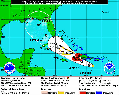 À 20h00, le centre d'ISAAC se situe dans un axe situé entre la République Dominicaine et Porto Rico (16.2N 67.8W), la tempête se dirige en direction Ouest Nord-Ouest à une vitesse de 26km/h et devrait rentrer dans les eaux de la République Dominicaine cette nuit, puis selon la prévision de trajectoire actuelle, rentrer sur le territoire Haïtien demain après-midi, mais les premiers effets devraient commencer à être ressentis dès demain matin puisque les vents s'étendent maintenant jusqu'à 295km de son centre, principalement au Nord-Est de celui-ci.