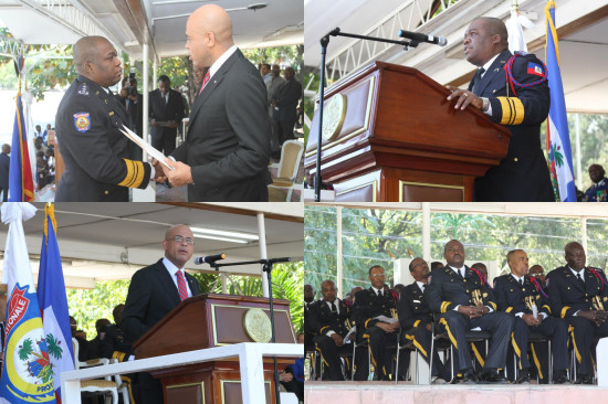 Après avoir été désigné par arrêté présidentiel et suite à sa ratification par les Sénateurs en août dernier, à 17 pour, 0 contre et une abstention [Jean Charles Moïse], Godson Aurélus, ex-directeur de la police judiciaire, est devenu le nouveau Directeur Général de la Police National d'Haïti (PNH), en remplacement de Mario Andrésol, hier jeudi, Godson Aurélus a finalement été installé officiellement dans ses fonctions à la tête de la PNH. La cérémonie s'est déroulée en présence du Premier Ministre, M. Laurent Salvador Lamothe, du Ministre de la Justice et de la Sécurité publique, M. Jean Renel Sanon, des membres du Haut état major de la PNH, des autorités civiles et religieuses, des personnalités du Corps Diplomatique ainsi que des représentants de la Communauté internationale, dans les locaux de l’académie de police. Lors de la cérémonie le DG de la Police a déclaré "Je connais les ressentiments et toutes les insatisfactions individuelles qui démotivent le personnel policier et dépouillent en fin de compte l’Institution policière de tous ses cadres les plus méritants, aujourd'hui donc je veux vous dire que nul n'est mieux placé que moi pour connaitre l'ampleur et des biens fondé des revendications," avec ses 17 ans de carrière au sein de l'institution policière où il a gravit tous les échelons, ajoutant "[...] et bien sur pour répondre à vos attentes. Heureusement que le problème d'armement est déjà en stade de résolution puisque nous venons de recevoir 11,000 pistolets des 15,000 déjà commandés, on peut facilement observer des déficits dans les domaines infra-structurelles, dans le domaine de la réglementation et du contrôle, dans le domaine de la planification stratégique, dans le domaine technique et opérationnel provoquant aussi bien une situation de précarité structurelle qu'un phénomène de l'instabilité organisationnel non-propice à l'implémentation d'une politique de sécurité durable..." Lors de son discours il a mis en évidence les carence en déficit de gestion des ressources humaines "...je dois malheureusement mentionner une faiblesse encore plus criante dont souffre de manière récurrente la PNH, c'est le déficit de gestion des ressources humaines, c'est justement ce problème majeur que mon administration compte s'attaquer dans l'immédiat..." Godson Aurélus entend également sévir contre les policiers avec des comportements en désaccord avec les principes de l'institution, Protéger et Servir. La police constituera "l'un des piliers sur lesquels s’édifiera le développement d’Haïti," a pour sa part affirmé le Président Martelly, précisant que le policier doit œuvrer à l'instauration de l'Etat de Droit, duquel en découlera un climat de sécurité, propice à l'investissement, le policier doit-être un agent de développement, "La Police Nationale d’Haïti constitue l’un des piliers à partir desquels s’édifiera le développement d’Haïti," a ajouté le Président Martelly, qui a salué les efforts consentis par l’ex-Directeur Général de la PNH pour renforcer l’institution policière, a demandé au nouveau Commandant en Chef d’aller de l’avant, de parfaire ce qui a été construit, promettant de s’évertuer à réduire les carences qui, à certains moments, gênent l’intervention efficace du corps, en contrepartie, il s’attend à ce que la PNH se crée plus de crédibilité, de prestige et de considération au sein de la société ; le banditisme, sous toutes ses formes, soit jugulé et que les familles ne soient plus endeuillées par des actes criminels ; s’établisse à nouveau dans notre pays, autrefois réputé pour sa douceur de vivre, cette paix des cœurs et des esprits qui permettait aux uns et aux autres de vaquer sereinement à leurs activités.