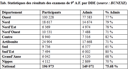 Le Ministère de l’Éducation Nationale et de la Formation professionnelle (MENFP) a publié les taux de réussites complets des examens de la 9e année fondamentale. Suivant les données fournies par le Bureau National des Examens d’État (BUNEXE), le taux de réussite global est de 75,68 %, soit 149,071 admis sur 196,973 participants.