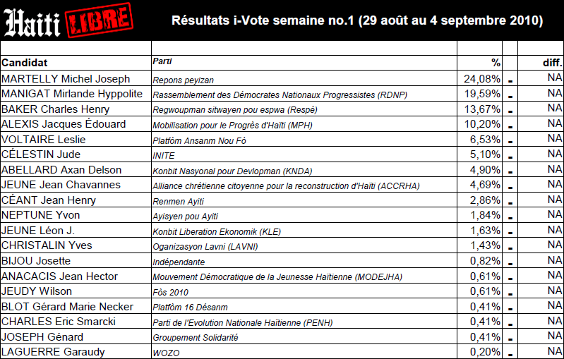 Every Sunday we will publish the i-Vote results on the website HaïtiLibre.com with trends compared to previous scores (upward or downward). I-Votes are cumulative from August 28 to November 21, 2010 inclusive, date of publication of our latest results (one week before the electoral deadline of November 28th, 2010).