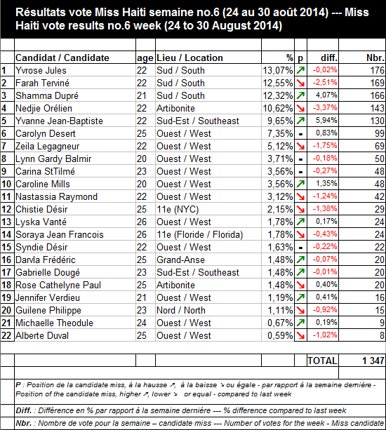 TOP 5 General Classification Week #6 (11.007 votes) : 1 - Nedjie Orélien (22) Artibonite, 21.36% of votes (ranking unchanged) 2 - Farah Terviné (22) Sud, 17.05% of votes (ranking unchanged) 3 - Zeila Legagneur (22) West, 7.23% of votes (ranking unchanged) 4 - Carolyn Desert (25) West, 6.26% of votes (ranking unchanged) 5 - Yvrose Jules (22) South, 6.2% des votes (ranking unchanged) Final ranking final HaitiLibre (22 candidates,% and number of votes) : https://www.haitilibre.com/vote-miss-haiti-2014-v2.php The vote HaitiLibre is now closed, thank you to all our readers for having encouraged with passions by their comments our Miss each more beautiful than the other. That the best won Saturday, Sept. 6, before the grand jury. Results Week #5 : https://www.haitilibre.com/en/news-11890-haiti-social-results-of-votes-miss-haiti-2014-week-5.html Results Week #4 : https://www.haitilibre.com/en/news-11840-haiti-social-results-of-votes-miss-haiti-2014-week-4.html Results Week #3 : https://www.haitilibre.com/en/news-11782-haiti-social-results-of-votes-miss-haiti-2014-week-3.html Results Week #2 : https://www.haitilibre.com/en/news-11730-haiti-social-results-of-votes-miss-haiti-2014-week-2.html Results Week #1 : https://www.haitilibre.com/en/news-11681-haiti-social-voting-results-miss-haiti-2014-week-1.html HL/ S/ HaitiLibre