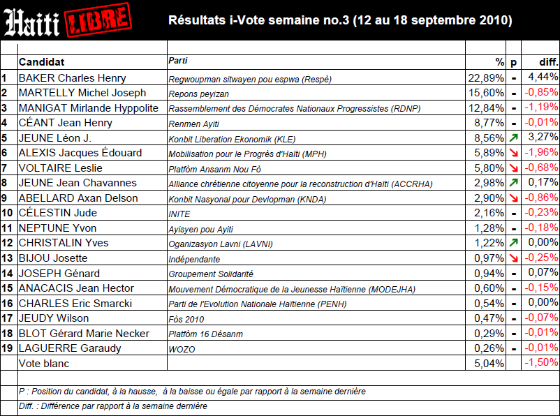 Haiti - i-Votes : Results third week 19/09/2010 10:55:27