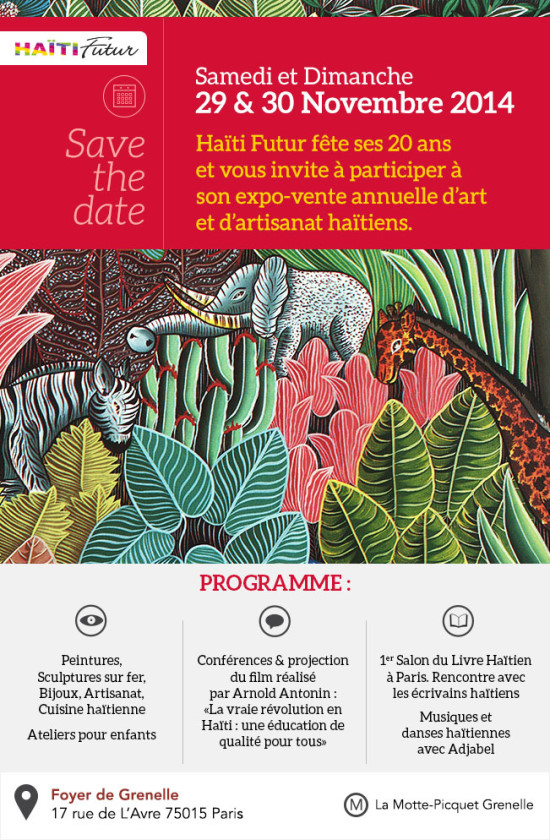 The 20th edition of the Edition of the Exhibition-sale of Haitian art and crafts, of the Haiti Future Association, will take place on Saturday 29 and Sunday, November 30, 2014 from 10:00 a.m. to 7:00 p.m., at the Foyer de Grenelle in Paris. A novelty this year for the 20 years of Haiti Future, the Exhibition-sale will host in partnership with Zellij Publishing and bookstore Le Divan, the first Haitian Book Fair. A wide selection of books will be offered to the public, and several meetings with writers will be led by Hélène Tirole, President of the Association "The word in all its arts," in the presence of many Haitian authors whose Louis-Philippe Dalembert and James Noël. It will also be an opportunity to celebrate the reissue of a major work in the literary history of Haiti "La Fille d’Haïti by Marie Vieux-Chauvet", an important event for posterity by this author who had been censured by the Duvalier dictatorship. During these two days, visitors can discover and buy paintings, iron objects carved, Haitian handicrafts, jewelery and fair trade products. A great opportunity to prepare for Christmas ! In order to discover the Haitian culture, visitors can also participate in workshops led by renowned Haitian artists such as dancer Karine Label, musician Atissou Loko (of group Adjabel) and Eddy Saint-Martin, visual artist and painter on silk. The program includes dance classes, drumming, cooking and painting on silk will be offered, as well as children's workshops scheduled during the afternoon. Saturday 29 from 7:00 p.m., an outstanding evening will be organized with director Arnold Antonin, who will present the film produced in collaboration with Haiti Future "The real revolution in Haiti, a quality education for all". Member of the Haitian community and friends of Haiti, we are waiting you in large numbers in the Foyer de Grenelle: 17 rue de l'Avre, Paris 15th. Access: Subway Motte-Picquet, Bus 80 and 82. Free admission