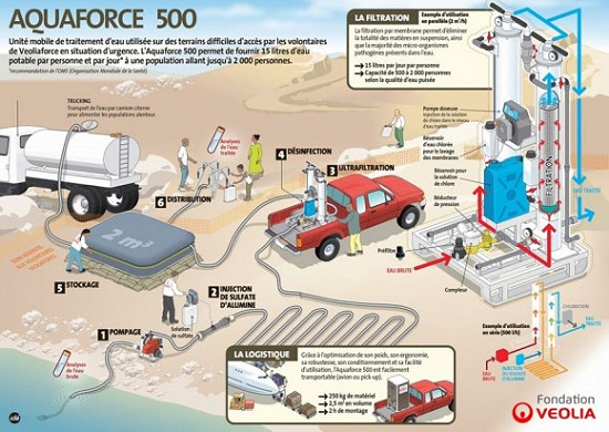 In addition to the two water purification stations, operated by agents of the French civil security in Jérémie, the French humanitarian aid includes six other mobile stations of water treatment, made available by the Veolia Foundation.