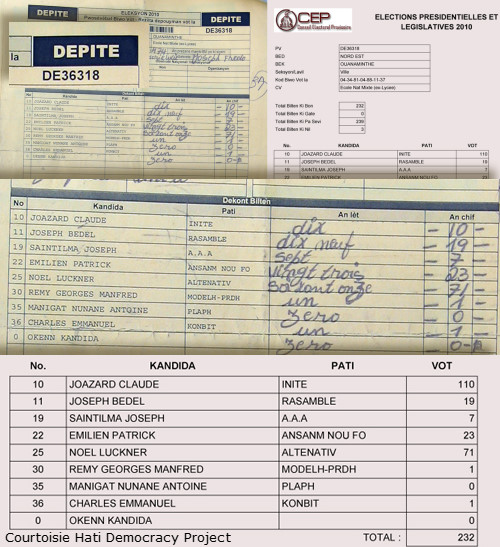 To allow all candidates to submit their applications to the instance of legal disputes before the final count of votes, the Provisional Electoral Council (CEP) has fixed to the December 13 the beginning of the period of contestations which will end Wednesday (72 hours). Philomé Pierre-Noël, President of the Departmental Electoral Office (BED) of the West 1, confirmed Monday that lawyers representing candidates of INITE, had submitted to the electoral authorities, some legal elements challenging the results of presidential and legislative. Thus, the candidate Jude Célestin "INITE" and Marie Denise Claude, candidate of the party for the Senate in the Western Department, both claim victory in the first round. Jude Célestin, qualified for the second round with 241.462 votes (22.48%) behind Mirlande H. Manigat 336.878 votes (31.37%) "Rassemblement des Démocrates Nationaux Progressistes (RDNP)" "claims a victory in the first round with 52 or 54% of the votes !" In a radio message, Jude Celestin has called for respect of the popular vote, deploring the violent protests in recent days. He assured that the popular vote will not be trampled, and he would defend this vote under the law. Arrangements have already been taken in this direction. Calling on his supporters to remain engaged in peace awaiting the final result and avoid provocations. Jude Célestin will he table the evidence of his frauds to explain that it are underestimated ? One of the techniques used by INITE is now known... it consisted in modifying with the seizure (tabulation center) the number of votes of minutes (PV) "INITE" as the example indicates it reproduced below : where 10 votes became 110. This example is far from being an isolated case, other minutes pass thus from 11 to 111, 18 to 118 etc... What is very worrying, is that these results were validated and entered into the computer system, in total disagreement with the minutes of the polling stations, implying complicity in the tabulation center... We are unaware of if this way of defrauding was used for the votes for the Senate and the Presidency, but the doubt exists.