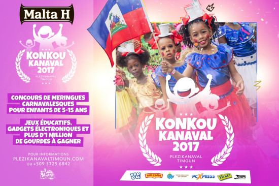 In order to promote the Haitian carnival, "Plezikanaval Timoun" organizes a great carnival contest for children "Konkou Kanaval Timoun 2017". Conditions of Participation and Regulations : Participants are encouraged to register online for free on the website : www.plezikanavaltimoun.com/ Participants must present an original carnivalesque meringue not exceeding 6 minutes. The meringue singer (s) must be between 5 and 15 years of age. Deadline for registration: January 27, 2017 10 semi-finalists will be selected by a jury composed of well-known personalities of Haitian music.
