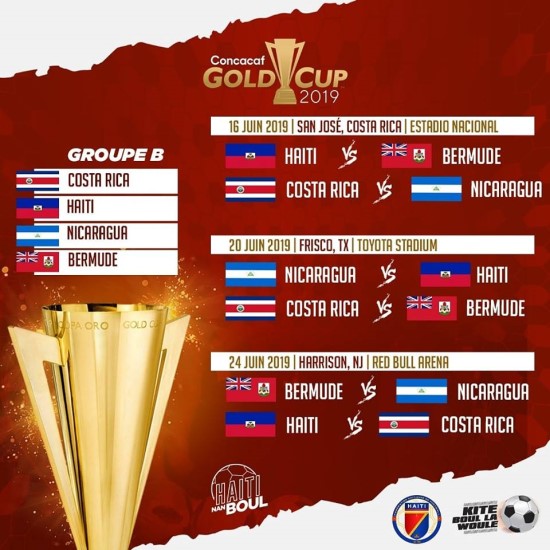 The Haitian football selection is straddling two regional competitions : The League of Nations of which it already knows the opponents of Group : Curaçao and Costa Rica https://www.haitilibre.com/en/news-27337-haiti-news-zapping.html and the Gold Cup Recall that the Gold Cup which has passed this year (2019) from 12 to 16 selections from the countries or regions members of Concacaf, will officially launch its 15th edition on June 15 to finish on July 7, in three different countries : the United States , Costa Rica and Jamaica with matches in no less than 16 host cities. On Wednesday in Los Angeles, California, Haitian coach Marc Collat was present at the Gold Cup draw ceremony, after which the Haitian selection will be in Group D and will face : Costa Rica, Nicaragua and Bermuda. Gold Cup Groups : Group A: Mexico- Canada- Martinique- Cuba. Group B: Costa Rica - Haiti - Nicaragua-Bermuda Group C: Honduras - Jamaica - Salvador-Curacao. Group D: USA - Panama - Trinidad-Guyana. Marc Collat's protégés will start the competition on June 16 against Bermuda at San Jose National Stadium in Costa Rica before flying to the United States and the State of Texas to play at Toyota Stadium in Frisco against Nicaragua on June 20; they will finish the pool phase with a match against Costa Rica in New Jersey on June 24 at Red Bull Arena.