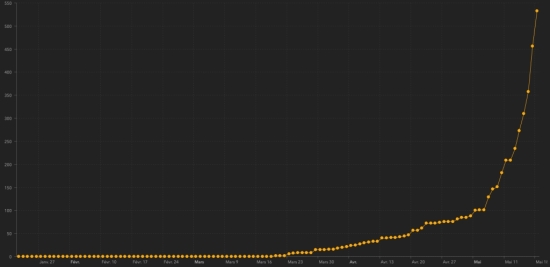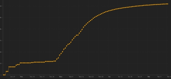 Tests: 11,834,508 people have been tested with the Covid-19 coronavirus throughout the United States, i.e. +335,305 tests in 24 hours (the day before: +422,024) including 1,439,557 in New York State (+26.161); 676,412 in Florida (+24,620) and 460,826 in Massachussets. Canada: 34,200 active cases +334 in 24 hours (the day before: +292) and 5,960 deaths +57 in 24 hours (the day before: +103). Healings: 39,251 people, +688 in 24 hours (the day before +731). France: 89,966 cases -289 (the day before: -1,653) and 28,220 deaths +131 (the day before: +483). Healings: 61,719 people +515 in 24 hours (the day before +147). Latin America and the Caribbean active cases: Brazil: 138,056 cases +7,220 in 24 hours Peru: 61,838 cases +834 in 24 hours Ecuador: 27,350 cases + 337 in 24 hours Chile: 25,416 +1,298 in 24 hours Colombia: 11,800 cases +1,549 in 24 hours Mexico: 10,913 cases +662 in 24 hours Dominican Republic: 5,678 cases -361 in 24 hours Argentina: 5,364 cases +238 in 24 hours Panama: 3,366 cases +116 in 24 hours Haiti: 491 cases +76 in 24 hours Jamaica: 380 cases -4 in 24 hours Cuba: 297 cases -1 in 24 hours Martinique: 98 cases (unchanged) French Guyana: 119 cases (-34) in 24 hours Guadeloupe: 70 cases (unchanged) Bahamas: 42 cases (-1) in 24 hours Saint Martin: 36 active cases (unchanged) Trinidad & Tobago: 1 case (unchanged) HAITI: Epidemiological situation: The Ministry of Public Health informs that +77 new cases have been confirmed, making a total of 533 in Haiti (40.3% women and 59.7% men) since the first case (March 19, 2020) https://www.haitilibre.com/en/news-30319-haiti-health-origin-of-the-first-2-cases-of-covid-19-in-haiti.html . This is the largest number of cases recorded in 24 hours since the first case in Haiti. (the day before: +98) 1 new death has been reported bringing the total to 21. The number of active cases in Haiti (excluding death and recovery) now stands at 491 cases (+ 18.3%) or +76 since the last report from the Ministry https://www.haitilibre.com/en/news-30805-haiti-covid-19-daily-report-may-18-2020.html Cases per day :