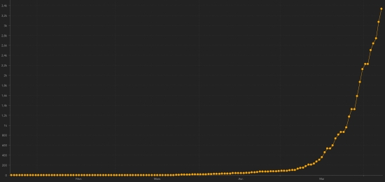 Number of suspected cases investigated since March 19 : 7,351 cases +677 in 24 hours (the day before: +48) People hospitalized and quarantine at home : information not available Cases confirmed by department (3.334) : West: 2,669 cases +233 (the day before: +87) Artibonite: 168 cases +2 (the day before: +4) Center: 102 cases +3 (the day before: +8) North: 81 cases unchanged (the day before: +14) Southeast: 75 cases +12 (the day before: +14) North West: 58 cases +5 (the day before: +4) South: 56 cases +2 (the day before: +1) Grand’Anse: 48 cases +5 North East: 44 cases unchanged (the day before: +10) Nippes: 33 cases unchanged (The day before: +6) Location of cases (3,334) : West : (2,669 cases) +233 Port-au-Prince : 674 cases +79 (the day before : +41) Delmas : 673 cases +43 (the day before : +13) Pétion-ville : 462 cases +25 (the day before : +3) Tabarre : 296 cases +25 (the day before : +12) Carrefour : 223 +34 (the day before : +6) Croix-des-Bouquets : 183 cases +21 (the day before : +5) Cité Soleil : 44 cases unchanged Kenskoff : 35 cases +1 (the day before : +2) Gressier 19 cases (unchanged) Léogâne : 18 cases (unchanged) Petit-Goâve : 12 cases +1 (the day before : +2) Cabaret : 11 case +5 Ganthier : 6 cases unchanged (the day before : +2) Archaie : 6 cases unchanged (the day before : +1) Cornillon : 3 cases (unchanged) Grand Goâve : 3 cases (unchanged) Thomazeau : 1 case (unchanged) Artibonite : (168 cases) +2 Saint Marc : 82 cases +2 (the day before : +4) Gonaïves : 38 cases (unchanged) Verettes : 17 cases unchanged (the day before : +1) L’Estère : 9 cases (unchanged) Marchand Dessalines : 7 cases (unchanged) Saint Michel : 4 cases (unchanged) Ennery : 3 cases (unchanged) Petite Rivière de l’Artibonite : 3 cases (unchanged) Anse Rouge : 2 cases (unchanged) Desdunes : 1 case (unchanged) Grande Saline : 1 case (unchanged) Marmelade : 1 case (unchanged) Center : (102 cases) +3 Mirebalais : 57 cases +1 (the day before +7) Hinche : 33 cases unchanged Lascaobas : 5 cases +1 (the day before : +1) Belladère : 2 cases (unchanged) Boucain Carré : 2 +1 Saut-d’Eau 1 case (unchanged) Savanette : 1 case (unchanged) Thomonde : 1 case (unchanged) North : (81 case) unchanged Cap Haïtien : 57 cases unchanged (the day before : +13) Limbé : 10 cases (unchanged) Limonade : 3 cases unchanged (the day before : +1) Plaisance du Nord : 3 cases (unchanged) Milot : 3 cases (unchanged) Acul du Nord : 2 cases (unchanged) Plaine du Nord : 2 cases (unchanged) Port Margot : 1 case (unchanged) South-East : (75 cases) +12 Jacmel : 57 cases +12 (the day before : +14) Côte-de-Fer : 4 cases (unchanged) Thiotte : 3 cases (unchanged) Vallée de Jacmel : 6 cases (unchanged) Belle Anse : 2 cases (unchanged) Marigot : 2 cases (unchanged) Bainet : 1 case (unchanged) North-West : (58 cases) +5 Port-de-Paix : 44 +1 case (the day before +4) Saint-louis du Nord : 5 cases +4 Jean Rabel : 3 cases (unchanged) Môle Saint-Nicolas : 3 cases unchanged) Bombardopolis : 2 cases (unchanged) Cansolme : 1 case (unchanged) South : (56 cases) +2 Cayes : 38 cases +1 (the day before : +1) Aquin : 6 cases (unchanged) Torbeck : 2 cases +1 Chantal : 2 cases (unchanged) Camp-Perrin : 1 case (unchanged) Cavaillon 1 case (unchanged) Chardonnières : 1 case (unchanged) Île-à Vache : 1 case (unchanged) Les Anglais : 1 case (unchanged) Port à Piment : 1 case (unchanged) Port-Salut : 1 case (unchanged) Saint-Louis du Sud : 1 case (unchanged) Grand'Anse : (48 cases) +5 Jérémie : 39 cases +4 cases Chambellan : 7 cases +1 Roseau : 1 case (unchanged) Pestel : 1 case (unchanged) North-East : (44 cases) unchanged Fort Liberté : 15 cases (unchanged) Ouanaminthe : 12 cases unchanged (the day before : +2) Trou du Nord : 8 cases (the day before : +1) Caracol 7 cases unchanged (the day before : +6) Carice 1 case (unchanged) Terrier Rouge : 1 case unchanged (the day before : +1) Nippes : (33 cases) unchanged Miragoâne : 10 cases unchanged (the day before : +2) Fond des Nègres : 6 cases unchanged Anse à Veau 5 cases (unchanged) Petite Riviere de Nippes : 4 cases unchanged (the day before : +4) L’Asile : 4 cases (unchanged) Arnaud : 1 case (unchanged) Paillant : 1 case (unchanged) Petit Trou de Nippes 1 case (unchanged) Plaisance du Sud : 1 case (unchanged) Distribution of cases by age group (3.334) : 0-9 years: 79 +5 10-19 years: 95 +3 20-29 years: 626 +48 30-39 years: 1.066 +91 40-49 years: 666 +53 50-59 years: 401 +26 60-69 years: 264 +27 70 and over: 137 +9 Distribution of deaths by age group (51) : 0-9 years: 1 death 10-19 years: 1 death 20-29 years: 2 deaths 30-39 years: 4 deaths 40-49 years: 10 deaths 50-59 years: 10 deaths 60-69 years: 9 deaths 70 and over: 14 deaths +1 Healings :: 24 (unchanged) Death : 51 +1 Mortality rate : 1.53% (-) UNITED STATES : Epidemiological situation : United States : Cases since the start of the epidemic : 1,942,363 cases +22,302 in 24 hours (the day before: +22,223) Healings : 506,367 people +5,518 (the day before +9,143) Death : 110,514 deaths +712 in 24 hours (the day before: +659) Active cases (less death and recovery): 1,325,482 cases +16,072 in 24 hours (the day before: +12,421) Tests : 20,235,678 people were tested +456,805 tests in 24 hours (the day before: +547,429). New York City : Cases since the start of the epidemic : 206,969 cases +458 in 24 hours (the day before +571) Death : 21,844 deaths +29 in 24 hours (the day before: +33) Miami Dade (FL) : Cases since the start of the epidemic : 19,547 cases +248 in 24 hours (the day before: +243) Death : 765 +0 death unchanged in 24 hours (the day before: +5) Florida : total number of people hospitalized since the start of the epidemic 11,215 people +52 in 24 hours (the day before: +97) Tests : 1,216,158 people tested +41,973 in 24h (the day before +39,245) New York State : Cases since the start of the epidemic : 378,097 cases +781 in 24 hours (the day before: +1,108) Healings : 67,544 people +183 in 24h (the day before: +269) Death : 30,374 