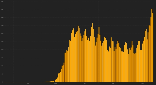 TOP 5 of the countries with the most active cases : 1st - USA: 1,705,476 cases (+33,487 in 24h), the day before (+37,654) 2nd - Brazil: 528,882 cases (+12,268 in 24h) the day before (+22,995) 3rd - United Kingdom: 266,777 cases (+801 in 24 hours), the day before (+1,195) 4th - Russia: 226,171 cases (+1,053 in 24 hours), the day before (-2,524) 5th - India: 203,051 cases (+5,664 in 24h), the day before (+7,924) TOP 5 of the countries with the most deaths : 1st - USA: 125,039 (+500 in 24h), the day before (+624) 2nd - Brazil: 57,070 deaths (+1,109 in 24 hours), the day before (+990) 3rd - United Kingdom 43,598 deaths (+100 in 24 hours), the day before (+184) 4th - Italy: 34,716 deaths (+38 in 24 hours), the day before (+0) 5th - France: 29,758 deaths (+26 in 48 hours), the day before (+11) Update not available. DIASPORA : United States : Cases since the beginning of the epidemic : 2,510,323 cases (+42,486 in 24h), the day before (+45,525) Healings : 679,308 people (+8,499 in 24h), the day before (+7,247) National Healing Rate : 27.06% (-) Death : 125,039 (+500 in 24h), the day before (+624) Active cases (less deaths and cures): 1,705,476 cases (+33,487 in 24 hours), the day before (+37,654) Canada : Cases since the start of the epidemic : 104,878 cases (+249 in 24h), the day before (+166) Healings : 67,445 people (+576 in 24h), the day before (+313) National Healing Rate : 64.311% (+) Death : 8,576 deaths (+5 in 24 hours), the day before (+4) National mortality rate : 8.18% (-) Active cases : (excluding death and recovery) 29,189 active cases (-332 in 24 hours), the day before (+162) France : (Update not available, data from the day before) Cases confirmed since the first case : 199,473 cases (+1,588 in 48 hours), the day before (+81) Healings : 75,639 people (+298 in 48 hours), the day before (+256) National Healing Rate : 37.92% (-) Death : 29,758 deaths (+26 in 48 hours), the day before (+11) Active cases : (excluding death and recovery) 94,076 cases (+1,019 in 48 hours), the day before (-217) Latin America and the Caribbean active cases : Brazil : 528,882 cases (+12,268 in 24h) the day before (+22,995) Peru : 102,830 cases (-789 in 24h), the day before (+ -4,997) Colombia : 49,406 cases (+2,691 in 24h), the day before (+5,596) Argentina : 36,393 (+1,385 in 24h), the day before (+2,134) Chile : 34,363 cases (-497 in 24h), the day before (+27) Mexico : 25,700 cases (-86) in 24 hours), the day before (+257) Ecuador : 23,230 cases (+273 in 24h), the day before (+241) Dominican Republic : 13,235 cases (+540 in 24h), the day before (+475) Panama : 14,696 cases (+636 in 24h), the day before (+387) Haiti : 4,968 cases (-15), the day before (+48) French Guiana : 3,138 cases (+190 in 24h), the day before (+207) Jamaica : 128 cases (-9 in 24 hours), the day before (-11) Martinique : 89 cases (-50), the day before (+6) Guadeloupe : 88 cases (+0), the day before (+8) Cuba : 57 cases (+5 in 24 hours), the day before: (-4) Bahamas : 6 cases (-3 in 24h) HAITI : Epidemiological situation : The Ministry of Public Health informs that 55 new cases of Covid-19 have been confirmed in Haiti (last report: +179, for a total of 5.777 cases throughout the national territory (40.7% women and 59.3% of men) since the first case (March 19, 2020 https://www.haitilibre.com/en/news-30319-haiti-health-origin-of-the-first-2-cases-of-covid-19-in-haiti.html ). Deaths : 2 new deaths in the North, bringing the national total to 100. Healings :: 709 people (+68), the day before (+129) Active cases : (less death and recovery) 4,968 cases (-15), the day before (+48) Number of suspected cases investigated since March 19 : 11,742 cases (+236 in 24 hours), the day before: (+131) People hospitalized : 158 people (+22 in 24h), the day before (+8) Home quarantine : 3,163 people (+24 in 24h), the day before (+225) Number of tests : 5,777 tests Graph *: daily confirmed cases
