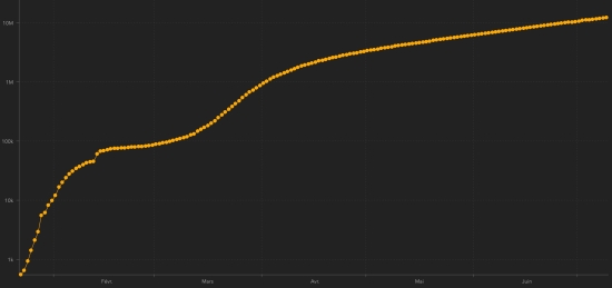 GLOBAL SITUATION : Friday, July 10, 2020, the number of people infected worldwide with the Covid-19 coronavirus since the start of the pandemic (Official source), amounted to 12,287,550 confirmed (+224,687 cases in 24 hours) , the day before: (+211,977). Number of contaminated countries 188 (unchanged) Bulletin from the day before : https://www.haitilibre.com/en/news-31239-haiti-covid-19-daily-report-july-9-2020.html Since the start of the pandemic 6,755,829 people have been cured of Covid-19 worldwide (+150,583 in 24 hours), the day before (+137,818) Since the start of the pandemic 555,324 people have died of Covid-19 worldwide (+5,424 in 24 hours), the day before (+5,178) The number of active cases worldwide (excluding death and recovery) is currently 4,976,397 cases (+68,680) in 24 hours (the day before: +68,981) Average cure rate in the world : 54.98% (+) Average mortality rate in the world : 4.52% (-) Chart: Trend of global spread