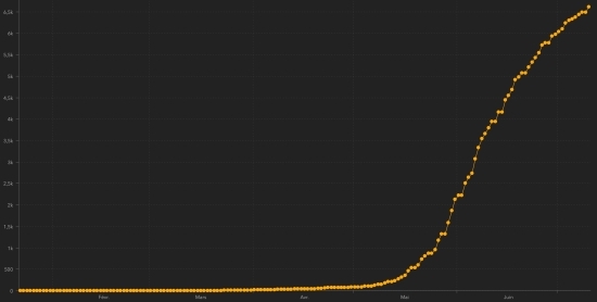 * Note : The Haitian health authorities having “omitted” 10 times to update the number of cases… consequently, this graph is a more positive than reality. Cases confirmed by department : West: 4,902 cases (+20), the day before: (+51) Artibonite: 347 cases (+5), the day before: (+5) Center: 299 cases (+1), the day before: (+2) North: 248 cases (unchanged), the day before: (+3) South: 173 cases (unchanged), the day before: (+9) Southeast: 164 cases (+6), the day before: (+13) North West: 140 cases (+2), the day before: (+4) Grand’Anse: 133 cases (unchanged), the day before: (+1) Northeast: 110 cases (+1), the day before: (+4) Nippes: 101 cases (unchanged), the day before: (+4) Location of cases : West : 4,902 cases (+20) Delmas : 1,212 cases (+2), the day before : (+11) Port-au-Prince : 1,036 cases (+4), the day before : (+3) Pétion-ville : 753 cases (+1), the day before : (+6) Tabarre : 604 cases (+2), the day before : (+3) Croix-des-Bouquets : 457 cases (+2), the day before : (+6) Carrefour : 366 cases (+3), the day before : (+9) Petit-Goâve : 105 cases (unchanged), the day before : (+3) Cité Soleil : 84 cases (unchanged) Cabaret : 57 cases (unchanged), the day before : (+5) Kenskoff : 54 cases (unchanged), the day before : (+1) Léogâne : 51 case (unchanged), the day before : (+3) Archaie : 33 cases (+2) Gressier 32 cases(+1) Anse à Galet : 27 cases (unchanged) Ganthier : 9 cases (unchanged), the day before : (+1) Cornillon : 8 cases (+1) Grand Goâve : 6 cases (+1) Fonds-Verettes : 4 (unchanged) Thomazeau : 4 cases (unchanged) Artibonite : 347 cases (+5) Saint Marc : 126 cases (+3) Gonaïves : 82 cases (+1), the day before : (+2) Verettes : 76 cases (+1), the day before : (+2) Petite Rivière de l’Artibonite : 11 case (unchanged) Gros Morne : 13 cases (unchanged) L’Estère : 9 cases (unchanged) Marchand Dessalines : 10 cases (+1), the day before : (+1) Desdunes : 5 cases (unchanged) Saint Michel : 5 cases (unchanged) Ennery : 3 cases (unchanged) La Chappelle : 2 cases (unchanged) Grande Saline : 2 cases (unchanged) Anse Rouge : 2 cases (unchanged) Marmelade : 1 case (unchanged) Center : 299 cases (+1) Mirebalais : 129 cases (+1), the day before : (+6) Hinche : 94 cases (unchanged) Boucan Carré : 27 cases (unchanged) Lascaobas : 19 cases (unchanged), the day before : (+1) Belladère : 12 cases (unchanged) Thomonde : 4 cases (unchanged) Savanette : 4 cases (unchanged) Saut-d’Eau 4 cases (unchanged) Cerca la Source : 3 cases (unchanged) Maissade : 2 cases (unchanged) Cerca Cavajal : 1 case (unchanged) North : 248 cases (unchanged) Cap Haïtien : 155 cases (unchanged) Limbé : 18 cases (unchanged), the day before : (+1) Milot : 12 cases (unchanged) Pignon : 11 case (unchanged) Grande Rivière du Nord : 10 cases (unchanged) Plaine du Nord : 10 cases (unchanged) Plaisance du Nord : 6 cases (unchanged), the day before : (+1) Borgne : 6 cases (unchanged) Limonade : 6 cases (unchanged) Quartier Morin : 5 cases (unchanged) Acul du Nord : 4 cases (unchanged) Dondon : 2 cases (unchanged), the day before : (+1) Pilate : 1 case (unchanged) Port Margot : 1 case (unchanged) Bahon : 1 case (unchanged) South : 173 cases (unchanged) Cayes : 104 cases (unchanged), the day before : (+2) Aquin : 19 cases (unchanged), the day before : (+3) Saint-Louis du Sud : 7 cases (unchanged), the day before : (+1) Port-Salut : 7 cases (unchanged) Camp-Perrin : 5 cases (unchanged), the day before : (+3) Torbeck : 5 cases (unchanged) Les Anglais : 5 cases (unchanged) Chardonnières : 5 cases (unchanged) Tiburon : 4 cases (unchanged) Port à Piment : 4 cases (unchanged) Coteaux : 2 cases (unchanged) Chantal : 2 cases (unchanged) St Jean du Sud : 2 cases (unchanged) Cavaillon 1 case (unchanged) Île-à Vache : 1 case (unchanged) South-East : 164 cases (+6) Jacmel : 129 cases (+6), the day before : (+6) Bainet : 9 cases (unchanged), the day before : (+6) Vallée de Jacmel : 7 cases (unchanged), Côte-de-Fer : 7 cases (unchanged) Thiotte : 4 cases (unchanged) Marigot : 3 cases (unchanged), the day before : (+1) Belle Anse : 2 cases (unchanged) Anse-à-Pitre : 2 cases (unchanged) Cayes Jacmel : 1 case (unchanged) North-West : 140 cases (+2) Port de Paix : 92 cases (+1) Bombardopolis : 12 cases (unchanged) Saint-louis du Nord : 12 cases (unchanged), the day before : (+2) Jean Rabel : 9 cases (unchanged), the day before : (+1) Môle Saint-Nicolas : 8 cases (unchanged), the day before : (+1) Chansolme : 3 cases (unchanged) La Tortue : 2 cases (unchanged) Anse-à-Foleur : 1 case (unchanged) Baie de Henne 1 case (+1) Grand'Anse : 133 cases (unchanged) Jérémie : 104 cases (unchanged), the day before : (+1) Anse d’Hainault : 14 (unchanged) Chambellan : 7 cases (unchanged) Pestel : 2 cases (unchanged) Irois : 2 cases (unchanged) Bonbon : 1 case (unchanged) Dame Marie : 1 case (unchanged) Moron : 1 case (unchanged) Roseaux : 1 case (unchanged) North-East : 110 cases (+1) Ouanaminthe : 33 cases (+1), the day before : (+1) Caracol 27 cases (unchanged) Fort Liberté : 20 cases (unchanged), the day before : (+1) Trou du Nord : 18 cases (unchanged) Terrier Rouge : 7 cases (unchanged), the day before : (+1) Mont Organisé : 2 cases (unchanged) Mombon Crochu 1 case (unchanged), the day before : (+1) Ferrier : 1 case (unchanged) Carice 1 case (unchanged) Nippes : 101 case (unchanged) Miragoâne : 46 cases (unchanged), the day before : (+1) Fond des Nègres : 17 cases (unchanged) Baradères : 8 cases (unchanged) Petite Riviere de Nippes : 6 cases (unchanged) Petit Trou de Nippes : 5 cases (unchanged), the day before : (+3) Plaisance du Sud : 5 cases (unchanged) Anse à Veau 5 cases (unchanged) L’Asile : 5 cases (unchanged) Paillant : 2 cases (unchanged) Arnaud : 1 case (unchanged) Grand Boucan : 1 case (unchanged) NOTE : "unchanged" means that there is no new data available: it may be the absence of new cases, unreported or incomplete cases or delay in transmission data to the Ministry which is the most common cause. D