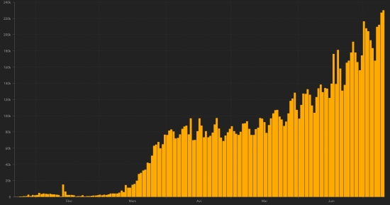 GLOBAL SITUATION : Saturday, July 11, 2020, the number of people infected worldwide with the coronavirus Covid-19 since the start of the pandemic (Official source), amounted to 12,519,361 confirmed (+231,811 cases in 24 hours) , the day before: (+224,687). Number of contaminated countries 188 (unchanged) Bulletin from the day before : https://www.haitilibre.com/en/news-31248-haiti-covid-19-daily-report-july-10-2020.html Since the start of the pandemic 6,899,467 people have been cured of Covid-19 worldwide (+143,638 in 24 hours), the day before (+150,583) Since the start of the pandemic 560,799 people have died of Covid-19 worldwide (+5.475 in 24 hours), the day before (+5.424) The number of active cases worldwide (excluding death and recovery) is currently 5,059,095 cases (+82,698) in 24 hours (the day before: +68,680) Average cure rate in the world : 55.11% (+) Average mortality rate in the world : 4.48% (-) World Chart: daily confirmed cases