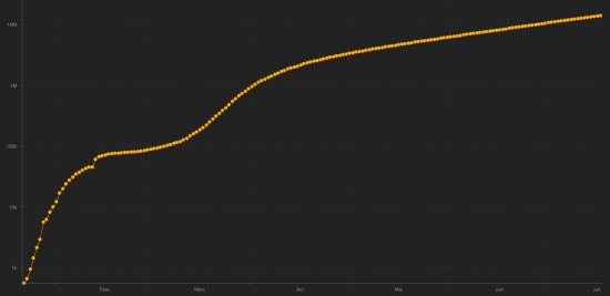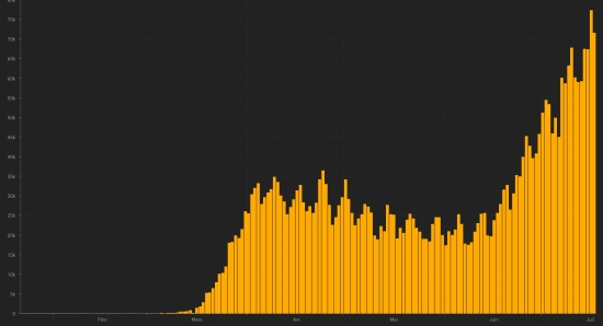 TOP 5 of the countries with the most active cases : 1st - USA: 2,401,245 cases (+53,819 in 24h), the day before (+61,330) 2nd - Brazil: 539.957 cases (+2.025 in 24 hours) the day before (+14.198) 3rd - India: 359,060 cases (+16,587 in 24 hours), the day before (+11,298) 4th - United Kingdom: 248,083 cases (+574 in 24h), the day before (+564) 5th - Russia: 206,078 cases (-1,350 in 24h), the day before (-1,463) TOP 5 of the countries with the most deaths : 1st - USA: 139,266 deaths (+907 in 24h), the day before (+939) 2nd - Brazil: 77,851 deaths (+1,163 in 24 hours), the day before (+1,322) 3rd - United Kingdom 45,318 deaths (+114 in 24 hours), the day before (+66) 4th - Mexico: 38,310 deaths (+736 in 24 hours), the day before (+668) 5th - Italy: 35,028 deaths (+3 in 24 hours), the day before (+20) DIASPORA : United States : Cases since the start of the epidemic : 3,647,715 cases (+71,285 in 24 hours), the day before (+77,032) Healings : 1,107,204 people (+16,559 in 24h), the day before (+14,763) National Healing Rate : 30.35% (-) Death : 139,266 deaths (+907 in 24h), the day before (+939) Active cases (minus deaths and cures): 2,401,245 cases (+53,819 in 24 hours), the day before (+61,330) Canada : Cases since the start of the epidemic : 111,559 cases (+415 in 24h), the day before (+451) Healings : 98,281 people (new method of calculating the authorities) National Healing Rate : 88.10% (+) Death : 8,884 deaths (+9 in 24 hours), the day before (+18) National mortality rate : 7.96% (-) Active cases : (excluding death and recovery) 4,394 active cases France : Cases confirmed since the first case : 211.943 (+841), previous (+534) Healings : 79,233 people (+208 in 24h), previous (+216) National Healing Rate : 37.38% (-) Death : 30,132 deaths (+14 in 24 hours), previous (+18) Active cases : (excluding death and recovery) 102,588 (+629), previous (+300) Latin America and the Caribbean active cases : Brazil : 539,957 cases (+2,025 in 24h) the day before (+14,198) Peru : 98,756 cases (+779 in 24h), the day before (-957) Colombia : 95,215 cases (+7,946 in 24h), the day before (+2,146) Argentina : 67,343 cases (+3,792 in 24h), the day before (+1,753) Ecuador : 35,790 cases (+892 in 48 hours), the day before (+368) Mexico : 28,786 cases (update not available), the day before (+425) Dominican Republic : 24,748 cases (+654 in 24h), the day before (+811) Chile : 24,302 cases (+3,195 in 24 hours), the day before (-1,270) advance by one place Panama : 23,850 (+319 in 24h), the day before (+375) French Guiana : 5,662 cases (+69 in 24h), the day before (+51) Haiti : 3,091 cases (-106 in 24h), the day before (-76) Martinique : 150 cases (unchanged) Jamaica : 80 cases (-28), the day before (-3) Guadeloupe : 93 cases (unchanged) Cuba : 57 cases (-11 in 24 hours), the day before (+4) Bahamas : 27 cases (+5), the day before (+3) HAITI : Epidemiological situation : According to the Ministry of Public Health, 27 new cases of Covid-19 have been confirmed in Haiti (previous: +46 in 24 hours), for a total of 6,975 cases throughout the national territory (40.70% women and 59.30% since the first case (March 19, 2020 https://www.haitilibre.com/en/news-30319-haiti-health-origin-of-the-first-2-cases-of-covid-19-in-haiti.html ). Deaths : 1 new death was recorded in the department of Grand’Anse bringing the national total to 146. Healings :: 3,738 people (+132), the day before (+122) Cure rate : 53.59% Active cases : (less death and recovery) 3,091 cases (-106 in 24 hours), the day before (-76) Imported cases : 106 cases (updated information not available) +49 cases between July 1 (reopening of airports) and the report of July 9 https://www.haitilibre.com/en/news-31239-haiti-covid-19-daily-report-july-9-2020.html . It should be noted that since July 9 https://www.haitilibre.com/en/news-31239-haiti-covid-19-daily-report-july-9-2020.html . the Ministry of communication no longer any data on the number and origin of imported cases which was on this date of 109 cases (last explanations of the Ministry on imported cases July 7 https://www.haitilibre.com/en/news-31207-haiti-flash-explanation-of-the-ministry-on-the-number-of-imported-cases.html Community cases (since March 19) : updated information not available since the report of July 9: 6,380 cases ( https://www.haitilibre.com/en/news-31239-haiti-covid-19-daily-report-july-9-2020.html ) Number of suspected cases investigated since March 19 : 16,300 cases (+180 in 24 hours), the day before (+460) Number of cases tested since the start of the pandemic : 15,557 (as of July 15) People currently hospitalized : (information not available) Home quarantine currently : (information not available) Graph *: daily confirmed cases