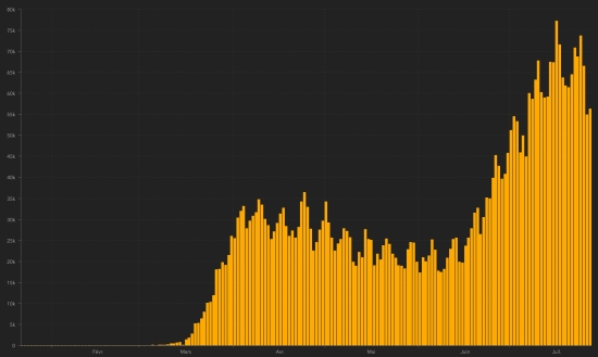 WORLD SITUATION: Tuesday, July 28, 2020, the number of people infected worldwide by the Covid-19 coronavirus since the start of the pandemic (Official source), amounts to 16,495,309 confirmed cases (+231,261 in 24 hours) , the day before: (+208,139). Number of contaminated countries 188 (unchanged) Bulletin of the day before: https://www.haitilibre.com/en/news-31388-haiti-covid-19-daily-report-july-27-2020.html Since the start of the pandemic 9,590,929 people have been cured of Covid-19 worldwide (+182,952 in 24 hours), the day before: (+140,376) Since the start of the pandemic 654,327 people have died from Covid-19 around the world (+5,361 in 24 hours), the day before (+4,305) The number of active cases in the world (excluding deaths and recoveries) is currently 6,250,053 cases (+42,948 in 24 hours), the day before: (+63,458) Average cure rate in the world: 58.14% (+) Average death rate in the world: 3.97% (-) TOP 5 countries with the most active cases: 1st - USA: 2,820,910 cases (+68,057 in 24 hours), the day before (+36,489) 2nd - Brazil: 508,116 cases (-11,058 in 24 hours) the day before (-3,531) 3rd - India: 495,499 cases (+10,222 in 24 hours), the day before (+17,275) 4th - United Kingdom: 254,427 cases (+678 in 24 hours), the day before (+729) 5th - Russia: 197,468 cases (+3,629 in 24 hours), the day before (+2,445) TOP 5 countries with the most deaths: 1st - USA: 148,056 deaths (+1,121 in 24 hours), the day before (+472) 2nd - Brazil: 87,618 deaths (+614 in 24 hours), the day before (+555) 3rd - United Kingdom 45,844 deaths (+7 in 24 hours), the day before (+14) 4th - Mexico: 44,022 deaths (+342 in 24 hours), the day before (+108) 5th - Italy: 35,112 deaths (+5 in 24 hours), the day before (+5) DIASPORA: United States: Cases since the start of the epidemic: 4,294,770 cases (+60,630 in 24 hours), the day before (+55,410) Healings: 1,325,804 people (+27,941 in 24 hours), the day before (+18,449) National Healing Rate: 30.87% (+) Death: 148,056 deaths (+1,121 in 24 hours), the day before (+472) Active cases (less deaths and cures): 2,820,910 cases (+68,057 in 24 hours), the day before (+36,489) Canada: Cases since the start of the epidemic: 116,471 cases (+682 in 24 hours), the day before (+319) Healings: 101,447 people (+478 in 24 hours), the day before (+204) National Healing Rate: 87.10% (-) Death: 8,945 deaths (+11 in 24 hours), the day before (+5) National death rate: 7.68% (-) Active cases: (excluding death and recovery) 6,079 cases (+193 in 24 hours), the day before (+110) France: Epidemiological situation: Cases confirmed since the first case: 220,352 (+3,155), previous (+1,062) Healings: 81,071 people (+124), previous (+343) National Healing Rate: 36.79% (-) Deaths: 30,189 deaths (+8 correction from Public Health France), previous (+10) Active cases: (excluding death and recovery) 109,092 (+2,271), previous (+777) Latin America and the Caribbean active cases: Brazil: 508,116 cases (-11,058 in 24 hours) the day before (-3,531) Peru: 98,752 cases (8,484 in 24 hours), the day before (-4,720) Argentina: 91,782 cases (+2,713 in 24 hours), the day before (+1,650) Dominican Republic: 32,859 cases (-383 in 24 hours), the day before (+1,381) Panama: 25,034 (+163 in 24h), the day before (+710) Chile: 18,782 cases (+199 in 24 hours), previous (+180) French Guiana: 6,533 cases (+129) Haiti: 2,817 cases (+24 in 24h), previous (+18) Bahamas: 280 cases (+40), the day before (+16) Martinique: 161 cases (unchanged) Jamaica: 129 cases (+11), the day before (+2) Guadeloupe: 105 cases (-1) Cuba: 94 cases (+35 in 24 hours), the day before (+13) HAITI: Epidemiological situation: According to the Ministry of Public Health, 25 new cases of Covid-19 would have been confirmed in Haiti in 24 hours the day before (+18), for a total of 7,340 cases throughout the national territory (41.0% of women and 59.0% men) from the first case (March 19, 2020 https://www.haitilibre.com/en/news-30319-haiti-health-origin-of-the-first-2-cases-of-covid-19-in-haiti.html ). Deaths: 1 new death was recorded in the Sud department, bringing the national total to 158 Healings: : 4,365 people (unchanged for 48 hours), previous (+129 in 48 hours) Healing rate: 59.47% (-) Active cases: (less deaths and recoveries) 2,817 cases (+24 in 24 hours), previous (+18) Imported cases: 152 cases since the reopening of airports and +43 since the last report dated July 9 (109) https://www.haitilibre.com/en/news-31348-haiti-flash-152-cases-imported-since-the-reopening-of-airports.html (update not available) Suspected cases investigated since March 19: 17,748 cases (+164 in 24 hours), previous (+241) Cases tested since the start of the pandemic: 17,292 as of July 26 (+163 in 24 hours) People currently hospitalized: (information not available) People in intensive care currently: (information not available) People in home quarantine currently: (information not available) Graph *: daily confirmed cases