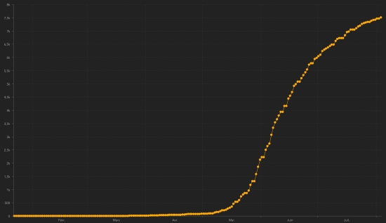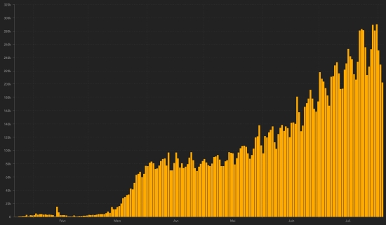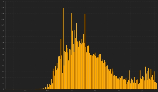 TOP 5 countries with the most active cases : 1st - USA: 3,048,799 cases (+4,391 in 24 hours), the day before (+40,240) 2nd - India: 586,298 cases (+6,941 in 24 hours), the day before (+1,627) 3rd - Brazil: 556,677 cases (-20,020 in 24 hours) the day before (+365) 4th - United Kingdom: 259,511 cases (+922 in 24 hours), the day before (+697) 5th - Russia: 185,200 cases (-2,884 in 24 hours), the day before (+1,672) TOP 5 countries with the most deaths : 1st - USA: 155,471 deaths (+611 in 24 hours), the day before (+411) 2nd - Brazil: 94,665 deaths (+561 in 24 hours), the day before (+541) 3rd - Mexico: 48,012 deaths (+266 in 24 hours), the day before (+274) 4th - United Kingdom 46,295 deaths (+9 in 24 hours), the day before (+8) 5th - India: 38.938 (+803 in 24 hours), the day before (+771) DIASPORA : United States : Cases since the start of the epidemic : 4,717,716 cases (+49,759 in 24 hours), the day before (+47,455) Healings : 1,513,446 people (+44,757 in 24 hours), the day before (+6,804) National Healing Rate : 32.08% (+) Death : 155,471 deaths (+611 in 24 hours), the day before (+411) Active cases (less deaths and cures): 3,048,799 cases (+4,391 in 24 hours), the day before (+40,240) Canada : Cases since the start of the epidemic : 118,973 cases (+205 in 24 hours), the day before (+245) Healings : 103,284 people (+83 in 24 hours), the day before (+129) National Healing Rate : 86.81% (-) Death : 8,995 deaths (+5 in 24 hours), the day before (+4) National death rate : 7.56% (-) Active cases : (excluding deaths and recoveries) 6,694 cases (+117 in 24 hours), the day before (+112) Chart: daily confirmed cases