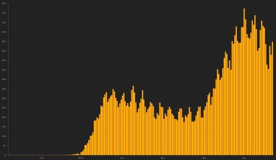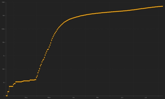 * Warning : The Haitian health authorities having "failed" 17 times to update the number of cases ... these graphs represent overall a more positive situation than reality .. Cases confirmed by department : West: 5.356 cases (+17), the day before: (+7) Artibonitis: 442 cases (+1), the day before: (+4) Center: 378 cases (+7) North: 355 cases (+4), the day before: (+1) Southeast: 214 cases (unchanged) South: 210 cases (+2) Northeast: 180 cases (+2) Northwest: 169 cases (unchanged) Grand'Anse: 154 cases (+4) Nippes: 124 cases (+1) Location of cases : West : 5,356 cases (+17) Delmas : 1,310 cases (+5), the day before : (+2) Port-au-Prince : 1,097 cases (+1) Pétion-ville : 795 cases (+4), the day before : (+3) Tabarre : 655 cases (+1), the day before : (+1) Croix-des-Bouquets : 509 cases (+1), the day before : (+1) Carrefour : 406 cases (+2) Petit-Goâve : 140 cases (unchanged) Cité Soleil : 91 case (+1) Cabaret : 72 cases (unchanged) Léogâne : 65 cases (unchanged) Kenskoff : 57 cases (unchanged) Gressier 39 cases (+1) Archaie : 37 cases (unchanged)) Anse à Galet : 34 cases (unchanged) Grand Goâve : 12 cases (unchanged) Ganthier : 11 case (unchanged) Thomazeau : 9 cases (+1) Cornillon : 8 cases (unchanged) Fonds-Verettes : 6 (unchanged) Pointe à Raquette : 3 cases (unchanged) Artibonite : 442 cases (+1) Saint Marc : 151 case (unchanged), the day before : (+1) Verettes : 104 cases (unchanged), the day before : (+1) Gonaïves : 102 cases (unchanged), the day before : (+1) Gros Morne : 18 cases (unchanged) Marchand Dessalines : 15 cases (unchanged), the day before : (+1) Petite Rivière de l’Artibonite : 14 cases (unchanged) L’Estère : 9 cases (unchanged) Saint Michel : 7 cases (unchanged) Desdunes : 6 cases (unchanged) Marmelade : 6 cases (+1) Ennery : 3 cases (unchanged) Grande Saline : 3 cases (unchanged) La Chappelle : 2 cases (unchanged) Anse Rouge : 2 cases (unchanged) Center : 378 cases (+7) Mirebalais : 142 cases (+2) Hinche : 131 case (+5) Boucan Carré : 30 cases (unchanged) Lascaobas : 25 cases (unchanged) Belladère : 17 cases (unchanged) Thomonde : 12 cases (unchanged) Savanette : 6 cases (unchanged) Saut-d’Eau 5 cases (unchanged) Cerca la Source : 4 cases (unchanged) Maissade : 3 cases (unchanged) Cerca Cavajal : 2 cases (unchanged) Thomassique : 1 case (unchanged) North : 355 cases (+4) Cap Haïtien : 214 cases (+1), the day before : (+1) Limbé : 27 cases (unchanged) Pignon : 17 cases (+1) Grande Rivière du Nord : 14 cases (unchanged) Milot : 13 cases (unchanged) Plaine du Nord : 11 case (unchanged) Borgne : 11 case (unchanged) Limonade : 10 cases (unchanged) Plaisance du Nord : 9 cases (unchanged) Quartier Morin : 8 cases (unchanged) Pilate : 7 cases (unchanged) Acul du Nord : 5 cases (unchanged) Port Margot : 4 cases (+2) Dondon : 3 cases (unchanged) Bahon : 1 case (unchanged) Saint Raphaël : 1 case (unchanged) South-East : 214 cases (unchanged) Jacmel : 162 cases (unchanged) Côte-de-Fer : 14 cases (unchanged) Bainet : 13 cases (unchanged) Vallée de Jacmel : 7 cases (unchanged) Thiotte : 7 cases (unchanged) Marigot : 4 cases (unchanged) Belle Anse : 3 cases (unchanged), Anse-à-Pitre : 2 cases (unchanged) Cayes Jacmel : 2 cases (unchanged) South : 210 cases (+2) Cayes : 119 cases (+2) Aquin : 21 case (unchanged) Saint-Louis du Sud : 11 case (unchanged) Les Anglais : 10 cases (unchanged) Port-Salut : 8 cases (unchanged) Torbeck : 7 cases (unchanged) Chardonnières : 6 cases (unchanged) Camp-Perrin : 6 cases (unchanged) Port à Piment : 5 cases (unchanged) Tiburon : 4 cases (unchanged) Coteaux : 3 cases (unchanged) Chantal : 2 cases (unchanged) Île-à Vache : 2 cases (unchanged) St Jean du Sud : 2 cases (unchanged) Cavaillon 2 cases (unchanged) Roche à Bateau : 1 case (unchanged) Maniche : 1 case (unchanged) North-East : 180 cases (+2) Ouanaminthe : 57 cases (+1) Caracol 36 cases (+1) Trou du Nord : 28 cases (unchanged) Fort Liberté : 24 cases (unchanged) Mombin Crochu 13 cases (unchanged) Terrier Rouge : 7 cases (unchanged) Mont Organisé : 5 cases (unchanged) Perches : 4 cases (unchanged) Carice : 2 cases (unchanged) Capotille : 2 cases (unchanged) Ferrier : 1 case (unchanged) Ste-Suzanne : 1 case (unchanged) North-West : 169 cases (unchanged) Port de Paix : 105 cases (unchanged) Saint-louis du Nord : 17 cases (unchanged) Bombardopolis : 13 cases (unchanged) Môle Saint-Nicolas : 12 cases (unchanged) Jean Rabel : 10 cases (unchanged) Chansolme : 4 cases (unchanged) La Tortue : 4 cases (unchanged) Baie de Henne 2 cases (unchanged) Anse-à-Foleur : 1 case (unchanged) Bassin Bleu : 1 case (unchanged) Grand'Anse : 154 cases (+4) Jérémie : 121 case (+3) Anse d’Hainault : 16 (+1) Chambellan : 7 cases (unchanged) Dame Marie : 3 cases (unchanged) Pestel : 2 cases (unchanged) Irois : 2 cases (unchanged) Bonbon : 1 case (unchanged) Moron : 1 case (unchanged) Roseaux : 1 case (unchanged) Nippes : 124 cases (+1) Miragoâne : 59 cases (+1) Fond des Nègres : 18 cases (unchanged) Baradères : 12 cases (unchanged) Anse à Veau 7 cases (unchanged) Petite Riviere de Nippes : 6 cases (unchanged) Plaisance du Sud : 6 cases (unchanged) Petit Trou de Nippes : 5 cases (unchanged) L’Asile : 5 cases (unchanged) Paillant : 4 cases (unchanged) Arnaud : 1 case (unchanged) Grand Boucan : 1 case (unchanged) Breakdown of confirmed cases : 0-9 years: 215 (+1) 10-19 years: 250 (unchanged) 20-29 years: 1,454 (+10) 30-39 years: 2,245 (+7) 40-49 years: 1,391 (+8) 50-59 years: 911 (+2) 60-69 years: 674 (+3) 70 years and over: 442 (+7) Distribution of deaths by age group : 0-9 years: 8 deaths (unchanged) 10-19 years: 3 deaths (unchanged) 20-29 years: 9 deaths (unchanged) 30-39 years: 13 deaths (unchanged) 40-49 years: 21 deaths (unchanged) 50-59 years: 33 deaths (unchanged) 60-69 years: 29 deaths (unchanged) 70 years and over: 55 deaths (unchanged) Deaths : 171 deaths (unchanged) Death rate : 2.26% (-) UNITED STATES : Epidemiological situation : United States : Cases since the start of t