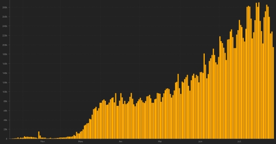 WORLD SITUATION : On Wednesday August 12, 2020, the number of people worldwide infected with the Covid-19 coronavirus since the start of the pandemic (Official source), amounts to 20,307,862 confirmed cases (+215,007 in 24 hours) , the day before (+215,594). Number of contaminated countries 188 (unchanged) Bulletin of the day before : https://www.haitilibre.com/en/news-31514-haiti-covid-19-daily-report-august-11-2020.html Since the start of the pandemic 12,602,544 people (+251,665 in 24 hours) have been cured of Covid-19 around the world, the day before (+ 176,793) Since the start of the pandemic 742,035 people (+5,781 in 24 hours) have died from Covid-19 around the world, the day before (+4,684) The number of active cases in the world (excluding deaths and recoveries) is currently 6,963,283 cases (-42,439 in 24 hours), the day before (-12,331) Average cure rate in the world : 62.06% (+) Average death rate in the world : 3.65% (-) World: Number of daily confirmed cases