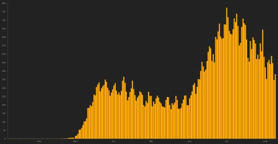 After a plateau phase reached on July 22, the number of new cases worldwide has been falling for 10 days now. Average cure rate in the world : 64.87% (+) Average death rate in the world : 3.44% (-) TOP 5 countries with the most active cases : 1st - USA: 3,542,856 cases (+13,840 in 24 hours), the day before (+22,617) 2nd - India: 704,348 cases (-6,423 in 24 hours), the day before (+3,083) 3rd - Brazil: 531,296 cases (-10,928 in 24 hours), the day before (-11,922) 4th - United Kingdom: 285,551 cases (+970 in 24 hours), the day before (+1,042) 5th - Spain: 226,188 (+19,338 in 24h) TOP 5 countries with the most deaths : 1st - USA: 177,279 deaths (+471 in 24 hours), the day before (+446) 2nd - Brazil: 115,309 deaths (+565 in 24 hours), the day before (+494) 3rd - Mexico: 60,800 deaths (+320 in 24 hours), the day before (+226) 4th - India: 58,390 (+848 in 24 hours), the day before (+836) 5th - United Kingdom 41.519 (+4 in 24 hours), the day before (+6) TOP 5 countries with the highest total number of healings : 1st - Brazil: 2,976,256 (+27,441 in 24 hours), cure rate 82.15% (+) 2nd - India: 2,404,585 (+66,550 in 24h), cure rate 75.92% (+) 3rd - USA: 2,020,774 people (+23,013 in 24 hours), cure rate 35.2% (+) 4th - Russia: 777,960 (+6,603 in 24h), cure rate 80.73% (+) 5th - South Africa: 516,494 (+10,024 in 24h), cure rate 84.47% (+) DIASPORA : United States : Cases since the start of the epidemic : 5,740,909 cases (+37,324 in 24 hours), the day before (+35,240) Healings : 2,020,774 people (+23,013 in 24 hours), the day before (+12,277) National Healing Rate : 35.2% (+) Death : 177,279 deaths (+471 in 24 hours), the day before (+446) Active cases (less deaths and cures): 3,542,856 cases (+13,840 in 24 hours), the day before (+22,617) Canada : Cases since the start of the epidemic : 127,594 cases (+777 in 24 hours), the day before (+257) Healings : 113,449 people (+613 in 24 hours), the day before (+215) National Healing Rate : 88.91% (-) Death : 9,129 deaths (+10 in 24 hours), the day before (+2) National death rate : 7.15% (-) Active cases : (excluding death and recovery) 5,016 cases (+154 in 24 hours), the day before (+40) COUNTRY: Number of daily confirmed cases