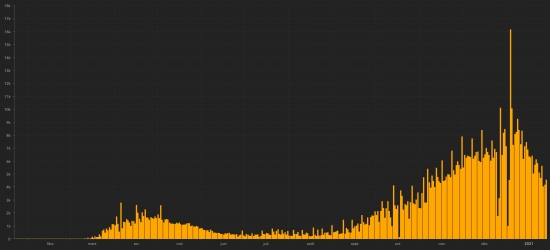 Vaccination: 82.48 million doses of vaccine injected (+2.19 million doses injected in 24 hours (updated January 28, 2021, latest data available). TOP 5 countries with the most active cases: (less deaths and recoveries) 1st - USA: 9,263,414 cases, (+37,376 in 24 hours), the day before (-25,033) 2nd - France: 2,877,635 (+21,743 in 24 hours), the day before (+25,713) 3rd - Spain: 2,496,819 cases (34,384 in 24 hours), the day before (39,788) 4th * - United Kingdom 1,966,672 cases (+27,441), the day before (+12,131) 5th - Brazil: 857,627 cases (+45,088 in 24 hours), the day before (-5,649) TOP 5 countries with the most deaths: 1st - USA: 433,195 deaths (+4,000 in 24 hours), the day before (+3,979) 2nd - Brazil: 221,547 deaths (+1.386 in 24 hours), the day before (+1.283) 3rd - Mexico: 155.145 deaths (+1.506 in 24 hours), the day before (+1.623) advance by one place 4th - India: 154,010 deaths (+163 in 24 hours), the day before (+123) 5th * - United Kingdom: 103,126 deaths (+1,239 in 24 hours), the day before (+1,631) TOP 5 countries with the highest number of healings: 1st - USA: 16,070,127 healings (+127,300 in 24h), cure rate 62.37% (+) 2nd - India: 10,394,352 healings (+20,746 in 24h), cure rate 96.96% (+) 3rd - Brazil: 7,979,513 healings (+15,337 in 24h), cure rate 88.09% (-) 4th - Russia: 3,220,651 healings (+25,826 in 24h), cure rate 85.39% (+) 5th - Turkey: 2,340,216 healings (+8,902), cure rate 95.24% (+) DIASPORA: USA: Case since the first case (March 9, 2020): 25,766,736 cases (+168,676 in 24 hours), the day before (+154,360) Healings: 16,070,127 healings (+127,300 in 24 hours), the day before (+175,414) National Healing Rate: 62.37% (+) Death: 433,195 deaths (+4,000 in 24 hours), the day before (+3,979) Active cases (less deaths and recoveries): 9,263,414 cases, (+37,376 in 24 hours), the day before (-25,033) Canada: Cases since the start of the epidemic (January 25, 2020): 770,427 cases (+4,562 in 24h), the day before (+4,168) Healings: 695,578 people (+5,209 in 24 hours), the day before (+5,552) National Healing Rate: 90.28% (+) Deaths: 19,659 deaths (+133 in 24 hours), the day before (+79) National death rate: 2.55% (+) Active cases: (excluding death and recovery) 55,190 cases (-1,246 in 24 hours), the day before (-1,463) Vaccination: 903,664 doses of vaccine injected since December 14, 2020, date of the first injection in Canada (+16,750 in 24 hours as of January 27, 2021 latest data available). Canada: Number of daily confirmed cases
