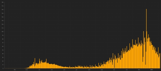 Vaccination: 123.54 million doses of vaccine injected (+4.05 million doses injected in 24 hours (updated February 5, 2021, latest data available). TOP 5 countries with the most active cases: (less deaths and recoveries) 1st - USA: 9,208,011 cases, (+15,954 in 24 hours), the day before (-7,402) 2nd - France: 3,055,054 (+20,272 in 24 hours), the day before (+21,588) 3rd - Spain: 2,730,228 cases (+27,981 in 24 hours), the day before (+29,528) 4th * - United Kingdom 1,937,664 cases (-16,035 in 24 hours), the day before (-3,878) 5th - Brazil: 820,983 cases (+19,682 in 24 hours), the day before (+1,328) TOP 5 countries with the most deaths: 1st - USA: 459,554 deaths (+3,685 in 24 hours), the day before (+5,072) 2nd - Brazil: 230,034 deaths (+1,239 in 24 hours), the day before (+1,232) 3rd - Mexico: 164,290 deaths (+1,368 in 24 hours), the day before (+1,682) 4th - India: 154,918 deaths (+95 in 24 hours), the day before (+120) 5th * - United Kingdom: 111,264 deaths (+1,014 in 24 hours), the day before (+1,322) TOP 5 countries with the highest number of healings: 1st - USA: 17,146,169 healings (+114,540 in 24 hours), cure rate 63.95% (+) 2nd - India: 10,510,796 healings (+30,346 in 24h), cure rate 97.19% (+) 3rd - Brazil: 8,396,148 healings (+84,267 in 24h), cure rate 88.87% (-) 4th - Russia: 3,398,545 healings (+45,825 in 24h), cure rate 86.97% (+) 5th - Turkey: 2,404,416 healings (+17,032), cure rate 95.53% (-) DIASPORA: USA: Case since the first case (March 9, 2020): 26,813,734 cases (+134,179 in 24 hours), the day before (+122,521) Healings: 17,146,169 healings (+114,540 in 24 hours), the day before (+124,851) National Healing Rate: 63.95% (+) Death: 459,554 deaths (+3,685 in 24 hours), the day before (+5,072) Active cases (less deaths and cures): 9,208,011 cases, (+15,954 in 24 hours), the day before (-7,402) Canada: Cases since the start of the epidemic (January 25, 2020): 802,530 cases (+4,136 in 24 hours), the day before (+3,982) Healings: 726,095 people (-3,673 Health Canada correction), the day before (+3,510) National Healing Rate: 90.48% (-) Death: 20,607 deaths (+121 in 24 hours), the day before (+125) National death rate: 2.57% (=) Active cases: (excluding death and recovery) 55,828 cases (+7,688 in 24 hours), the day before (+347) Vaccination: 1.04 million doses of vaccine injected since December 14, 2020, the date of the first injection in Canada (+20,000 doses in 24 hours as of February 5, 2021, latest data available). Canada: Number of daily confirmed cases