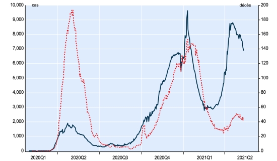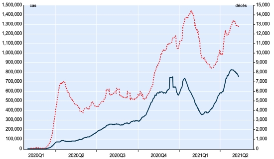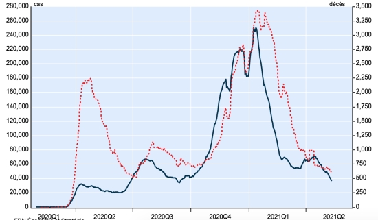 New case in blue numbers on the left - New deaths in red numbers on the right Vaccination: 1.41 billion doses of vaccine injected (+10 million doses injected in 24 hours updated May 14, 2021 latest data available). TOP 5 countries with the most active cases: (less deaths and recoveries) 1st - USA: 6,351,878 cases, (-8,480 in 24 hours), the day before (-7,764) 2nd * - India: 3,673,780 cases (-31,080 in 24 hours), the day before (-5,631) 3rd * - Brazil: 1,060,173 cases (+33,271 in 24 hours), the day before (+17,689) 4th - France: 698.147 (-36.522 in 24 hours), the day before (-19.599) 5th * - Iran: 459,522 cases (-6,364 in 24 hours), the day before (-3,854) TOP 5 countries with the most deaths: 1st - USA: 599,314 deaths (+774 in 24 hours), the day before (+755) 2nd * - Brazil: 432,785 deaths (+2,189 in 24 hours), the day before (+2,340) 3rd * - India: 266,229 deaths (+3,879 in 24 hours), the day before (+3,999) 4th * - Mexico: 220,159 deaths (+258 in 24 hours), the day before (+311) 5th * - United Kingdom: 127,668 deaths (+17 in 24 hours), the day before (+11) TOP 5 countries with the highest number of healings: 1st - USA: 26,712,821 healings (+45,622 in 24 hours), cure rate 79.35% (+) 2nd * - India: 20,432,898 healings (+353,299 in 24 hours), cure rate 83.83% (+) 3rd * - Brazil: 14,028,355 healings (+49,026 in 24h), cure rate 90.38% (-) 4th * - France: 5,042,584 people (+43,374 in 24 hours), cure rate 86.22% (+) 5th * - Turkey: 4,894,024 people (+37,261 in 24 hours), cure rate 96.04% (+) DIASPORA: United States: * Case since the first case (March 9, 2020): 33,664,013 cases (+37,916 in 24 hours), the day before (+39,961) * Healings: 26,712,821 healings (+45,622 in 24h), the day before (+46,970) National Healing Rate: 79.35% (+) * Death: 599,314 deaths (+774 in 24 hours), the day before (+755) * Active cases (less deaths and recoveries): 6,351,878 cases, (-8,480 in 24 hours), the day before (-7,764) Canada: * Cases since the start of the epidemic (January 25, 2020): 1,318,405 cases (+5,991 in 24 hours), previous (+6,644) * Healings: 1,220,110 people (+7,996 in 24h), previous (+7,786) National Healing Rate: 92.54% (+) * Death: 24,869 deaths (+44 in 24h), previous (+59) National death rate: 1.88% (-) * Active cases: (excluding death and recovery) 73,426 (-2,049 in 24h), previous (-1,201) Vaccination: 17.73 million doses of vaccine injected since December 14, 2020, date of the first injection in Canada (+430,000 doses injected in 24 hours updated May 14, 2021 latest data available). Canada: Number of daily confirmed cases