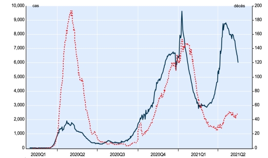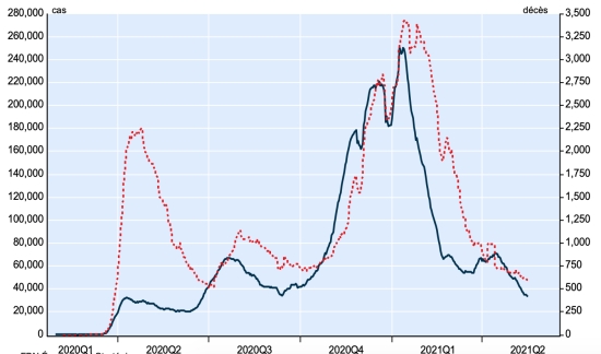New case in blue numbers on the left - New deaths in red numbers on the right Vaccination: 1.5 billion doses of vaccine injected (+30 million doses injected in 24 hours updated May 17, 2021 latest data available). TOP 5 countries with the most active cases: (less deaths and recoveries) 1st - USA: 5,944,597 cases, (-35,187 in 24 hours), the day before (-17,649) 2nd * - India: 3,353,733 cases (-163,243 in 24 hours), the day before (-101,447) 3rd * - Brazil: 1,071,811 cases (-22,554 in 24 hours), the day before (+1,000) 4th - France: 620.759 (-32.626 in 24 hours), the day before (-22.575) 5th * - Iran: 446,240 cases (-1,868 in 24 hours), the day before (-4,283) TOP 5 countries with the most deaths: 1st - USA: 600,533 deaths (+386 in 24 hours), the day before (+284 2nd * - Brazil: 436,862 deaths (+1,039 in 24 hours), the day before (+971) 3rd * - India: 278,751 deaths (+4,340 in 24 hours), the day before (+4,092) 4th * - Mexico: 220,489 deaths (+56 in 24 hours), the day before (+53) 5th * - United Kingdom: 127,684 deaths (+5 in 24 hours), the day before (+4) TOP 5 countries with the highest number of healings: 1st - USA: 27,202,309 healings (+66,289 in 24 hours), cure rate 80.60% (+) 2nd * - India: 21,596,512 healings (+422,436 in 24 hours), cure rate 85.60% (+) 3rd * - Brazil: 14,152,433 healings (+55,146 in 24h), cure rate 90.36% (+) 4th * - France: 5,152,566 people (+35,780 in 24 hours), cure rate 87.61% (+) 5th * - Turkey: 4,961,120 people (+13,864 in 24 hours), cure rate 96.67% (+) DIASPORA: United States: * Case since the first case (March 9, 2020): 33,747,439 cases (+31,488 in 24 hours), the day before (+20,035) * Healings: 27,202,309 healings (+66,289 in 24 hours), the day before (+37,400) National Healing Rate: 80.60% (+) * Death: 600,533 deaths (+386 in 24 hours), the day before (+284) * Active cases (less deaths and recoveries): 5,944,597 cases, (-35,187 in 24 hours), the day before (-17,649) Canada: * Cases since the start of the epidemic (January 25, 2020): 1,334,108 cases (+5,526 in 24 hours), previous (+4.901) * Healings: 1,241,500 people (+8,213 in 24h), previous (+6,417) National Healing Rate: 93.05% (+) * Death: 24,983 deaths (+35 in 24h), previous (+40) National death rate: 1.87% (=) * Active cases: (excluding death and recovery) 67.625 (-2.722 in 24 hours), previous (-1.556) Vaccination: 18.81 million doses of vaccine injected since December 14, 2020 date of the first injection in Canada (+390,000 doses injected in 24 hours updated May 17, 2021 latest data available). Canada: Number of daily confirmed cases