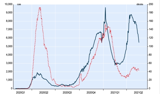 New cases in blue numbers on the left - New deaths in red numbers on the right France: * Cases confirmed since the first case (January 24, 2020): 5,568,551 ** cases (+15,515), the day before (+ 19,050) ** figure corrected by the Public Health France SPF (-348,846 case) * Healings: 5,162,624 people (), the day before (+29,118) National Healing Rate: 92.71% (+) SPF correction Death: 108,314 (+133 in 24 hours in hospitals +0 in EMS / EHPAD), the day before in total, (+141) * Active cases: (excluding death and cures) 297,613 (SPF correction), the day before (-11,811) Latin America and the Caribbean active cases (less deaths and recoveries): * Brazil: 1,068,205 cases (-24,996 in 24 hours), the day before (-5,288) * Argentina: 339,211 cases (+9,466 in 24 hours), the day before (+22,333) * Mexico: 259,873 cases (+749 in 24 hours), the day before (-51) * Peru: 122,442 cases (+6.526 in 24 hours), the day before (+5.451) advance by one place * Colombia: 114,746 cases (-2,324 in 24 hours), the day before (+2,475) Dominican Republic: 42,110 cases (+927 in 24 hours) the day before (+601) * Ecuador: 40,734 cases (+2,305 in 24 hours), the day before (+1,339 ) advance one place * Chile: 38,716 cases (+2,665 in 24 hours), the day before (-799) * Jamaica: 23,127 cases (-23 in 24 hours), the day before (-41) * Guadeloupe: 14,059 cases (unavailable), the day before (+505 in 6 days) * French Guiana: 12,503 cases (+226 in 24 hours), the day before (+267) * Martinique: 11.675 (unavailable 2nd day), the day before (unavailable) * Cuba: 6,912 cases (-66 in 24 hours), the day before (+210) * Panama: 5,821 cases (+159 in 48 hours), the day before (+126) * Bahamas: 953 cases (+7 in 24 hours), the day before (+10) Haiti: 885 cases (unavailable), the day before (+26) HAITI: Epidemiological situation: Warning: The Ministry of Public Health and Population (MSPP) did not make available after May 16, 2019 daily data on the situation of Covid-19 in Haiti As a result , the information below on the situation in Haiti is the latest data available . According to the Ministry of Public Health, 26 new cases of Covid-19 were confirmed in Haiti on May 16, 2021 (latest partial data available) for a total of 13,624 cases confirmed throughout the national territory since the first case (March 19, 2020 https://www.haitilibre.com/en/news-30319-haiti-health-origin-of-the-first-2-cases-of-covid-19-in-haiti.html ). Last update (78 new cases on May 15, 2021) Healings: 12,463 people (unchanged since May 15) Healing rate: 91.47% (-) Deaths: 276 deaths, (unchanged since May 15) Death rate: 2.02% (=) Active cases: (less deaths and cures) 885 cases (+26 in 24 hours), the day before (+50) Imported cases: 152 cases since the reopening of airports and +43 since the last report dated July 9 (109 cases) https://www.haitilibre.com/en/news-31348-haiti-flash-152-cases-imported-since-the-reopening-of-airports.html (Since then, this information is no longer made available) Suspected cases since March 19: 64,303 cases (+69 in 24 hours) update May 16, latest data available. Cases tested since the start of the pandemic: 67,472 cases (+139 in 24 hours) update May 16, latest data available. Note that the very low number of people tested does not statistically make it possible to make a representative estimate of the cases of Covid-19 in Haiti. People hospitalized: 1,966 since the start of the epidemic (updated May 16, 2021, latest data available) People in intensive care: (not available) Person in isolation: 885 as of May 15 (latest data available) People currently treated at home: 1,225 as of May 14, latest data available). Cases confirmed by department: West: 9,715 (+24) North: 842 (unchanged) Artibonite: 703 (+1) Center: 706 (+1) Northeast: 383 (unchanged) South-East: 307 (unchanged) South: 302 (unchanged) Northwest: 288 (unchanged) Grand'Anse: 240 (unchanged) Nippes: 161 (unchanged) UNITED STATES: Epidemiological situation: United States: * Case since the first case (March 9, 2020): 33,833,181 cases (+30,857 in 24 hours), the day before (+27,379) * Healings: 27,358,651 healings (+59,571 in 24h), the day before (+45,853) National Healing Rate: 80.86% (+) * Death: 602,616 deaths (+667 in 24 hours), the day before (+619) National death rate: 1.78% (=) * Active cases (less deaths and recoveries): 5,871,914 cases, (-29,281 in 24 hours), the day before (-19,093) * Tests: 470,118,034 people tested since the first case. USA: Number of daily confirmed cases: