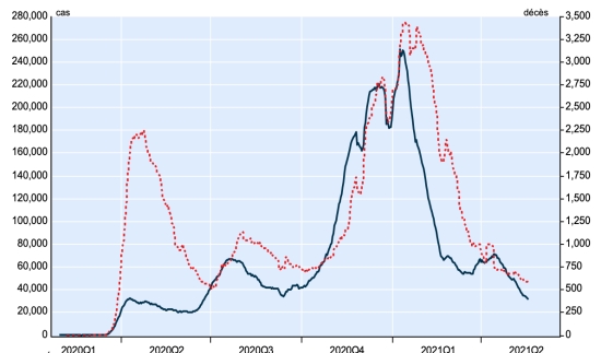 New cases in blue numbers on the left - New deaths in red numbers on the right Vaccination: 1.56 billion doses of vaccine injected (+30 million doses injected in 24 hours updated May 19, 2021 latest data available). TOP 5 countries with the most active cases: (less deaths and recoveries) 1st - USA: 5,871,914 cases, (-29,281 in 24 hours), the day before (-19,093) 2nd * - India: 3,027,891 cases (-101,953 in 24 hours), the day before (-96,847) 3rd * - Brazil: 1,068,205 cases (-24,996 in 24 hours), the day before (-5,288) 4th * - Iran: 436,025 cases (-5,695 in 24 hours), the day before (-2,117) 5th * - Argentina 339,211 cases (enters the TOP 5) TOP 5 countries with the most deaths: 1st - USA: 602,616 deaths (+667 in 24 hours), the day before (+619) 2nd * - Brazil: 444,391 deaths (+2.527 in 24 hours), the day before (+2.485) 3rd * - India: 291,365 deaths (+4.209 in 24 hours), the day before (+3.880) 4th * - Mexico: 221,080 deaths (+230 in 24 hours), the day before (+104) 5th * - United Kingdom: 127,701 deaths (+7 in 24 hours), the day before (+3) TOP 5 countries with the highest number of healings: 1st - USA: 27,358,651 healings (+59,571 in 24 hours), cure rate 80.86% (+) 2nd * - India: 22,712,735 healings (+357,295 in 24 hours), cure rate 87.24% (+) 3rd * - Brazil: 14,385,962 healings (+55,844 in 24h), cure rate 90.48% (-) 4th * - France: 5,162,624 people (SPF correction), cure rate 92.71% (+) 5th * - Turkey: 4,989,787 people (+9,271 in 24 hours), cure rate 96.69% (+) DIASPORA: United States: * Case since the first case (March 9, 2020): 33,833,181 cases (+30,857 in 24 hours), the day before (+27,379) * Healings: 27,358,651 healings (+59,571 in 24h), the day before (+45,853) National Healing Rate: 80.86% (+) * Death: 602,616 deaths (+667 in 24 hours), the day before (+619) * Active cases (less deaths and recoveries): 5,871,914 cases, (-29,281 in 24 hours), the day before (-19,093) Canada: * Cases since the start of the epidemic (January 25, 2020): 1,347,445 cases (+5,057 in 24 hours), previous (+4,247) * Healings: 1,262,366 people (+6,652 in 24 hours), previous (+7,332) National Healing Rate: 93.68% (+) * Death: 25,111 deaths (+45 in 24h), previous (+48) National death rate: 1.86% (=) * Active cases: (excluding death and recovery) 59.968 (-1.640 in 24 hours), previous (-3.133) Vaccination: 19.44 million doses of vaccine injected since December 14, 2020 date of the first injection in Canada (+350,000 doses injected in 24 hours updated May 18, 2021 latest data available). Canada: Number of daily confirmed cases