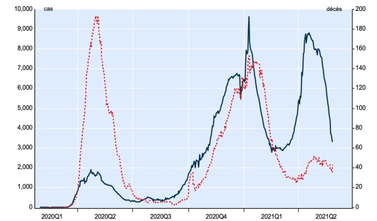 New cases in blue numbers on the left - New deaths in red numbers on the right Vaccination: 1.84 billion doses of vaccine injected (+30 million doses injected in 24 hours updated May 28, 2021 latest data available). TOP 5 countries with the most active cases: (less deaths and recoveries) 1st - USA: 5,646,656 cases, (-43,419 in 24 hours), the day before (-12,685) 2nd * - India: 2,228,724 cases (-114,428 in 24 hours), the day before (-76,727) 3rd * - Brazil: 1,122,220 cases (+23,103 in 24 hours), the day before (+12,287) 4th * - Iran: 396,291 cases (-3,643 in 24 hours), the day before (-7,572) 5th * - Argentina 372,886 cases (+5,280 in 24 hours), the day before (+2,347) TOP 5 countries with the most deaths: 1st - USA: 608,961 deaths (+1,235 in 24 hours), the day before (+1,547) 2nd * - Brazil: 459,171 deaths (+2,418 in 24 hours), the day before (+2,130) 3rd * - India: 322,512 deaths (+3,617 in 24 hours), the day before (+3,632) 4th * - Mexico: 223,068 deaths (+411 in 24 hours), the day before (+425) 5th * - United Kingdom: 127,768 deaths (+10 in 24 hours), the day before (+10) TOP 5 countries with the highest number of healings: 1st - USA: 27,767,040 healings (+65,161 in 24 hours), cure rate 81.61% (+) 2nd * - India: 25,178,011 healings (+284,601 in 24 hours), cure rate 90.79% (+) 3rd * - Brazil: 14,811,266 healings (+24,974 in 24h), cure rate 90.35% (-) 4th * - France: 5,303,714 people (+19,450) in 24 hours, cure rate 93.92% (+) 5th * - Turkey: 5,083,099 people (+12,284 in 24 hours), cure rate 97.22% (+) DIASPORA: United States: * Case since the first case (March 9, 2020): 34,022,657 cases (+22,977 in 24 hours), the day before (+28,473) * Healings: 27,767,040 healings (+65,161 in 24 hours), the day before (+39,611) National Healing Rate: 81.61% (+) * Death: 608,961 deaths (+1,235 in 24 hours), the day before (+1,547) * Active cases (less deaths and recoveries): 5,646,656 cases, (-43,419 in 24 hours), the day before (-12,685) Canada: * Cases since the start of the epidemic (January 25, 2020): 1,374,275 cases (+3,202 in 24 hours), the day before (+2,967) * Healings: 1,308,932 people (+5,374 in 24 hours, the day before (+5,598) National Healing Rate: 95.24% (+) * Death: 25,440 deaths (+29 in 24 hours), the day before (+50) National death rate: 1.85% (=) * Active cases: (excluding death and cures) 39,903 (-2,201 in 24 hours), the day before (-2,681) Vaccination: 22.81 million doses of vaccine injected since December 14, 2020, date of the first injection in Canada (+460,000 doses injected in 24 hours updated May 28, 2021 latest data available). Canada: Number of daily confirmed cases