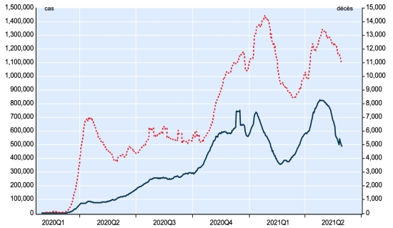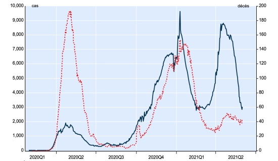 New cases in blue numbers on the left - New deaths in red numbers on the right France: * Cases confirmed since the first case (January 24, 2020): 5,677,172 cases (+9,848 cases in 24 hours), the day before (+1,211) * Healings: 5,353,767 people (+20,044 in 24 hours), the day before (+18,529) National Healing Rate: 94.30% (+) Death: 109,662 (+134 in 24 hours in hospitals +0 in EMS / EHPAD), the day before in total, (+126) * Active cases: (excluding death and cures) 213,743 (-10,330 in 24 hours), the day before (-17,444) Latin America and the Caribbean active cases (less deaths and recoveries): * Brazil: 1,092,114 cases (-27,963 in 24 hours), the day before (+20,207) * Argentina: 357,069 cases (+3,980 in 24 hours), the day before (-3,996) * Mexico: 266,483 cases (+4,776 in 24 hours), the day before (-1,309) * Peru: 171,080 cases (+5,818 in 48 hours), the day before (unavailable) * Colombia: 149,719 cases (+1,610 in 24 hours), the day before (+7,073) Dominican Republic: 48,581 cases (+1,019 in 24 hours) the day before (-273) * Chile: 44,153 cases (-1,853 in 24 hours), the day before (+185) * Ecuador: 31,919 cases (+1,605 in 24 hours), the day before (+169) * Jamaaica : 22,160 cases (-151 in 24 hours), the day before (-157) * Guadeloupe: 16,530 cases (-344 in 24 hours), the day before (+2,815 in 11 days) * French Guiana: 14,098 cases (+173 in 24 hours, the day before (+273 in 3 days) * Martinique: 11,847 cases (+80 in 24 hours, the day before (-212 in 6 days) * Panama: 6,412 cases (+85 in 24 hours), the day before (+46) * Cuba: 6,019 cases (-73 in 24 hours), the day before (-103) Haiti: 2,058 cases (+356 in 48 hours), the day before (+101 in 24 hours) * Bahamas: 825 cases (-11 in 24 hours), the day before (-38 in 48 hours) HAITI: Epidemiological situation: According to the Ministry of Public Health, 366 new cases within 48 hours of Covid-19 have been confirmed in Haiti, including 146 cases on May 27 and 220 cases on May 28, 2021 (latest partial data available) for a total of 14,931 cases confirmed throughout the national territory since the first case (March 19, 2020 https://www.haitilibre.com/en/news-30319-haiti-health-origin-of-the-first-2-cases-of-covid-19-in-haiti.html). Last update (112 new cases on May 26, 2021) Healings: 12,552 people (+6 in 48 hours) Healing rate: 84.06% (-) Deaths: 321 deaths, (+4 in 48 hours) (3 West Dept, 1 Central Dept) Death rate: 2.14% (-) Active cases: (less deaths and recoveries) 2,058 cases (+356 in 48 hours), the day before (+101 in 24 hours) Imported cases: 152 cases since the reopening of airports and +43 since the last report dated July 9 (109 cases) https://www.haitilibre.com/en/news-31348-haiti-flash-152-cases-imported-since-the-reopening-of-airports.html (Since then, this information is no longer made available) Suspected cases since March 19: 67,831 cases (+1,342 in 72 hours) update May 28, latest data available. Cases tested since the start of the pandemic: 73,002 cases (+1,460 in 48 hours) update May 28, latest data available. Note that the very low number of people tested does not statistically make it possible to make a representative estimate of the cases of Covid-19 in Haiti. People hospitalized: 2,292 since the start of the epidemic (+69 in 48 hours) Update May 28, 2021, latest data available. People in intensive care: (not available) Person in isolation: 2,058 since the start of the epidemic (+457 in 72 hours) on May 27 (latest data available) People currently treated at home: 3,163 since the start of the epidemic (+1,105 in 72 hours) as of May 27 (latest data available). Cases confirmed by department: West: 10,681 (+298) North: 918 (+15) Center: 802 (+24) Artibonite: 750 (+6) North-East: 393 (+4) South-East: 335 (+3) South: 315 (+1) Northwest: 299 (unchanged) Grand'Anse: 271 (+15) Nippes: 167 (unchanged) UNITED STATES: Epidemiological situation: United States: * Case since the first case (March 9, 2020): 34,136,738 cases (+23,592 in 24 hours), the day before (+70,078) * Healings: 27,940,918 healings (+77,078 in 24 hours), the day before (+22,956) National Healing Rate: 81.85% (+) * Death: 610,436 deaths (+669 in 24 hours), the day before (+223) National death rate: 1.78% (=) * Active cases (less deaths and recoveries): 5,585,384 cases, (-54,155 in 24 hours), the day before (+46,899) * Tests: 480,948,786 people tested since the first case. USA: Number of daily confirmed cases: