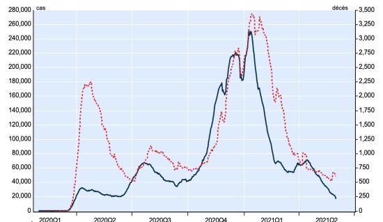 New cases in blue numbers on the left - New deaths in red numbers on the right Vaccination: 1.94 billion doses of vaccine injected (+40 million doses injected in 24 hours updated May 31, 2021 latest data available). TOP 5 countries with the most active cases: (less deaths and recoveries) 1st - USA: 5,585,384 cases, (-54,155 in 24 hours), the day before (+46,899) 2nd * - India: 1,793,633 cases (-101,873 in 24 hours), the day before (-130,559) 3rd * - Brazil: 1,092,114 cases (-27,963 in 24 hours), the day before (+20,207) 4th * - Iran: 365,900 cases (-8,396 in 24 hours), the day before (-6,331) 5th * - Argentina 357,069 cases (-3,980 in 24 hours), the day before (-3,996) TOP 5 countries with the most deaths: 1st - USA: 610,436 deaths (+669 in 24 hours), the day before (+223) 2nd * - Brazil: 465,312 deaths (+2,346 in 24 hours), the day before (+874) 3rd * - India: 335,114 deaths (+3,205 in 24 hours), the day before (+2,782) 4th * - Mexico: 223,568 deaths (unavailable), the day before (+61) 5th * - United Kingdom: 127,782 deaths (unavailable), the day before (+1) TOP 5 countries with the highest number of healings: 1st - USA: 27,940,918 healings (+77,078 in 24 hours), cure rate 81.85% (+) 2nd * - India: 26,179,085 healings (+231,456 in 24 hours), cure rate 92.48% (+) 3rd * - Brazil: 15,068,146 healings (+103,515 in 24 hours), cure rate 90.63% (+) 4th * - France: 5,353,767 people (+20,044 in 24 hours), cure rate 94.30% (+) 5th * - Turkey: 5,124,081 people (+9,457 in 24 hours), cure rate 97.48% (+) DIASPORA: United States: * Case since the first case (March 9, 2020): 34,136,738 cases (+23,592 in 24 hours), the day before (+70,078) * Healings: 27,940,918 healings (+77,078 in 24 hours), the day before (+22,956) National Healing Rate: 81.85% (+) * Death: 610,436 deaths (+669 in 24 hours), the day before (+223) * Active cases (less deaths and recoveries): 5,585,384 cases, (-54,155 in 24 hours), the day before (+46,899) Canada: * Cases since the start of the epidemic (January 25, 2020): 1,383,215 cases (+1,633 in 24 hours), the day before (+2,611) * Healings: 1,326,485 people (+4,207 in 24 hours, the day before (+4,754) National Healing Rate: 95.89% (+) * Death: 25,566 deaths (+19 in 24 hours), the day before (+35) National death rate: 1.84% (=) * Active cases: (excluding death and cures) 31.164 (-2.593 in 24 hours), the day before (-2.178) Vaccination: 23.86 million doses of vaccine injected since December 14, 2020, date of the first injection in Canada (+390,000 doses injected in 24 hours updated May 31, 2021 latest data available). Canada: Number of daily confirmed cases