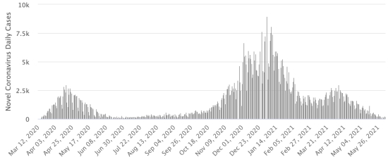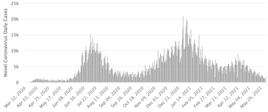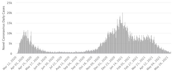 New cases in blue numbers on the left - New deaths in red numbers on the right Vaccination: 297.72 million doses of vaccine injected since December 14, 2020, the date of the first injection in the United States (+810,000 doses injected, in 24 hours). Updated 3 June 2021 last available data). New York State: * Cases since the start of the epidemic (March 1, 2020): 2,157,246 cases (+976 in 24 hours), the day before (+905) * Healings: 1,743,945 healings (+6,544 in 24h) the day before (+6,306) Healing rate: 80.84% (+) * Death: 53,706 deaths (+52 in 24 hours), the day before (+16) Death rate: 2.48% (=) * Active cases 359,595 cases (-5,620 in 24 hours), the day before (-5,417) * Tests: 56,364,498 people tested since the first case. New York State: Number of daily confirmed cases: