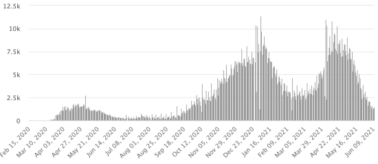 Vaccination: 2.26 billion doses of vaccine injected (+40 million doses injected in 24 hours updated June 9, 2021 latest data available). TOP 5 countries with the most active cases: (less deaths and recoveries) 1st - USA: 5,383,382 cases, (-13,760 in 24 hours), the day before (-11,809) 2nd * - India: 1,121,653 cases (-46,280 in 24 hours), the day before (-63,453) 3rd * - Brazil: 1,062,270 cases (-13,520 in 24 hours), the day before (-18,132) 4th * - Argentina 342,813 cases (-3,548 in 24 hours), the day before (+6,068) 5th * - Iran: 309,349 cases (-9,164 in 48h), the day before (-1,978 in 48h) TOP 5 countries with the most deaths: 1st - USA: 614,007 deaths (+513 in 24 hours), the day before (+442) 2nd * - Brazil: 482,135 deaths (+2,344 in 24 hours), the day before (+2,484) 3rd * - India: 363,097 deaths (+3,402 in 24 hours), the day before (+6,138) 4th * - Mexico: 229,578 deaths (+225 in 24 hours), the day before (+253) 5th * - Peru: 187,847 deaths (+368 in 24 hours), the day before (+322) TOP 5 countries with the highest number of healings: 1st - USA: 28,278,394 healings (+24,303 in 24 hours), cure rate 82.50% (+) 2nd * - India: 27,790,073 healings (+134,458 in 24 hours), cure rate 94.92% (+) 3rd * - Brazil: 15,670,754 healings (+73,938 in 24 hours), 91.02% cure rate (-) 4th * - France: 5,471,149 healings (+12,735 in 24 hours), cure rate 95.48% (+) 5th * - Turkey: 5,186,728 healings (+13,542 in 24 hours), cure rate 97.62% (+) DIASPORA: United States: * Case since the first case (March 9, 2020): 34,275,783 cases (+11,056 in 24 hours), the day before (+21,861) * Healings: 28,278,394 healings (+24,303 in 24h), the day before (+33,228) National Healing Rate: 82.50% (+) * Death: 614,007 deaths (+513 in 24 hours), the day before (+442) * Active cases (less deaths and recoveries): 5,383,382 cases, (-13,760 in 24 hours), the day before (-11,809) Canada: * Cases since the start of the epidemic (January 25, 2020): 1,398,275 cases (+1,477 in 24 hours), the day before (+ 1,388) * Healings: 1,353,147 people (+2,569 in 24 hours, the day before (+2,498) National Healing Rate: 96.77% (+) * Death: 25,873 deaths (+30 in 24 hours), the day before (+52) National death rate: 1.85% (=) * Active cases: (excluding death and recovery) 19,255 (-1,122 in 24 hours), the day before (-1,162) * Tests: 35,504,029 people tested since the first case. Vaccination: 27.26 million doses of vaccine injected since December 14, 2020 date of the first injection in Canada (+400,000 doses injected in 24 hours updated June 9, 2021 latest data available). Canada: Number of daily confirmed cases