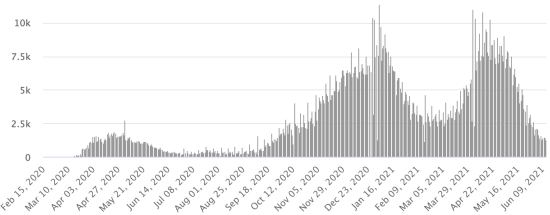Vaccination: 2.26 billion doses of vaccine injected (+40 million doses injected in 24 hours updated June 9, 2021 latest data available). 1 TOP 5 countries with the most active cases: (less deaths and recoveries) 1st - USA: 5,319,295 cases, (-26,089 in 24 hours), the day before (-37,998) 2nd * - Brazil: 1,129,463 cases (+31,186 in 24 hours), the day before (+36,007) 3rd * - India: 1,026,136 cases (-54,538 in 24 hours), the day before (-40,979) 4th * - Argentina 330,784 cases (-9,006 in 24 hours), the day before (-3,023) 5th * - Iran: 298,330 cases (-8,150 in 24 hours), the 2,869 (-9,164 in 48 hours) TOP 5 countries with the most deaths: 1st - USA: 614,955 deaths (+217 in 24 hours), the day before (+731) 2nd * - Brazil: 486,358 deaths (+2,008 in 24 hours), the day before (+2,215) 3rd * - India: 370,407 deaths (+3,310 in 24 hours), the day before (+4,000) 4th * - Mexico: 230,095 deaths (+274 in 24 hours), the day before (+243) 5th * - Peru: 188,443 deaths (+343 in 24 hours), the day before (+253) TOP 5 countries with the highest number of healings: 1st - USA: 28,381,623 healings (+35,299 in 24 hours), cure rate 82.70% (+) 2nd * - India: 28,043,446 healings (+132,062 in 24 hours), cure rate 95.25% (+) 3rd * - Brazil: 15,761,177 healings (+42,584 in 24h), cure rate 90.70% (-) 4th * - France: 5,493,293 healings (+9,604 in 24 hours), cure rate 95.73% (+) 5th * - Turkey: 5,198,057 healings (+5,112 in 24 hours), cure rate 97.60% (-) DIASPORA: United States: * Case since the first case (March 9, 2020): 34,315,873 cases (+9,427 in 24 hours), the day before (+30,663) * Healings: 28,381,623 healings (+35,299 in 24h), the day before (+67,930) National Healing Rate: 82.70% (+) * Death: 614,955 deaths (+217 in 24 hours), the day before (+731) * Active cases (less deaths and recoveries): 5,319,295 cases, (-26,089 in 24 hours), the day before (-37,998) Canada: * Cases since the start of the epidemic (January 25, 2020): 1,401,006 cases (+1,290 in 24 hours), the day before (+ 1,441) * Healings: 1,357,493 people (+2,074 in 24 hours, the day before (+2,272) National Healing Rate: 96.89% (+) * Death: 25,914 deaths (+28 in 24 hours), the day before (+13) National death rate: 1.84% (=) * Active cases: (excluding death and cures) 17,599 (-812 in 24 hours), the day before (-844) * Tests: 35,639,265 people tested since the first case. Vaccination: 27.26 million doses of vaccine injected since December 14, 2020 date of the first injection in Canada (+400,000 doses injected in 24 hours updated June 9, 2021 latest data available). Canada: Number of daily confirmed cases
