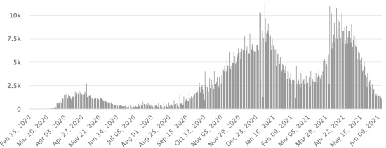 France: * Cases confirmed since the first case (January 24, 2020): 5,740,665 cases (+2,855 cases in 24 hours), the day before (+3,972) * Healings: 5,495,488 healings (+2,195 in 24 hours), the day before (+9,604) National Healing Rate: 95.72% (-) Deaths: 110,420 deaths (+13 in 24 hours in hospitals +0 in EMS / EHPAD), the day before in total, (+34) * Active cases: (excluding death and recovery) 134,757 (+647 in 24 hours), the day before (-8,743) Latin America and the Caribbean active cases (less deaths and recoveries): * Brazil: 1,131,972 cases (+25,090 in 24 hours), the day before (+31,186) * Argentina: 317,497 cases (-13,287 in 24 hours), the day before (-9,006) * Mexico: 269,776 cases (-216 in 24 hours), the day before (-739) * Colombia: 179,790 cases (+7,394 in 24 hours), the day before (+7,413) advances one place * Peru: 171,080 cases (unavailable since June 3), the day before (unavailable) Dominican Republic: 53,254 cases (-293 in 24 hours) the day before (+186) * Chile: 46,579 cases (-818 in 24 hours), the day before (-1,426) * Jamaica: 20,738 cases (-133 in 24 hours), the day before (-117) * Ecuador: 19,241 cases (+796 in 24 hours), the day before (+966) * French Guiana: 15,378 cases (unavailable 2nd day), the day before (unavailable) * Guadeloupe: 14,133 cases (unavailable 4th day), the day before (unavailable) * Martinique: 11,914 cases (unavailable 5th day), the day before (unavailable) * Panama: 9,414 cases (+323 in 24 hours), the day before (+264) * Cuba: 6,862 cases (+431 in 24 hours), the day before (+183) Haiti: 3,643 cases (+346 in 48h), previous (+122 in 24h) * Bahamas: 775 cases (unavailable 2nd day), the day before (unavailable) HAITI: Epidemiological situation: According to the Ministry of Public Health, 355 new cases within 48 hours of Covid-19 would have been confirmed in Haiti on June 8 and 9, 2021 (latest partial data available) for a total of 16,561 cases confirmed throughout the national territory since the first case (March 19, 2020 https://www.haitilibre.com/en/news-30319-haiti-health-origin-of-the-first-2-cases-of-covid-19-in-haiti.html). Last update (127 in 24 hours on June 7, 2021). Healings: 12,563 people (+3 in 48 hours) Healing rate: 75.85% (-) Deaths: 355 deaths (+6 in 48 hours) Cumulative deaths since the start of the pandemic: