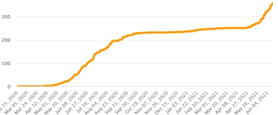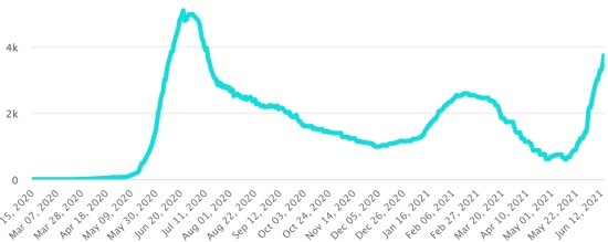 According to the Ministry of Public Health, 101 new cases and 3 deaths in 24 hours of Covid-19 and its variants would have been confirmed in Haiti on June 10, 2021 (latest data partial available) for a total of 16,662 cases and 358 deaths since the start of the pandemic. As of June 10, the total of the 3rd wave (44 days) is 3,339 cases (+ 3.12%) and 93 deaths (+ 7.1%). For reference in April 2021 (pre-3rd wave, 30 days) 267 new cases and 9 deaths. had been recorded. Last Minute : Monday Frantz Exantus, the Secretary of State for Communication evoked the possibility of renewing the state of emergency which will be on the agenda at the next Council of Ministers where the Covid and health measures will be at the heart of the agenda. Cases confirmed by department : West: 11,960 (+58) North: 973 (+2) Center: 861 (+9) Artibonite: 802 (+1) North-East: 465 (+7) South-East: 392 (+7) South: 389 (+9) North-West: 305 (+1) Grand'Anse: 330 (+5) Nippes: 185 (+2) Haiti : Total active cases since the start of the pandemic :