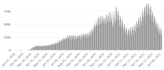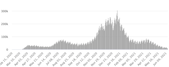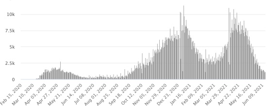 France: * Cases confirmed since the first case (January 24, 2020): 5,741,354 cases (+689 cases in 24 hours), the day before (+2,855) * Healings: 5,498,659 healings (+3,271 in 24h), the day before (+2,195) National Healing Rate: 95.77% (+) Deaths: 110,454 deaths (+63 in 24 hours in hospitals +0 in EMS / EHPAD), the day before in total, (+13) * Active cases: (excluding death and recovery) 132.241 (-2.516 in 24 hours), the day before (+647) Latin America and the Caribbean active cases (less deaths and recoveries): * Brazil: 1,112,193 cases (+19,779 in 24 hours), the day before (+25,090) * Argentina: 310,659 cases (-6,838 in 24 hours), the day before (-13,287) * Mexico: 268,590 cases (-1,186 in 24 hours), the day before (-216) * Colombia: 170,525 cases (-9,265 in 24 hours), the day before (+7,394) * Peru: 171,080 cases (unavailable since June 3), the day before (unavailable) Dominican Republic: 52,966 53,254 cases (-288 in 24 hours) the day before (-293) * Chile: 45,304 cases (-1,275 in 24 hours), the day before (-818) * Jamaica: 20,613 cases (-125 in 24 hours), the day before (-117) * Ecuador: 19,443 cases (+202 in 24 hours), the day before (+796) * French Guiana: 15,657 cases (+279 in 72h), the day before (unavailable) * Guadeloupe: 14,133 cases (unavailable 5th day), the day before (unavailable) * Martinique: 11,914 cases (unavailable 6th day), the day before (unavailable) * Panama: 9,533 cases (+119 in 24 hours), the day before (+323) * Cuba: 7,104 cases (+242 in 24 hours), the day before (+431) Haiti: 3,741 cases (+98 in 48h), previous (+346 in 48h) * Bahamas: 826 cases (+51 cases in 72h), the day before (unavailable) HAITI: Epidemiological situation: According to the Ministry of Public Health, 101 new cases in 24 hours of Covid-19 and its Alpha and Gamma variants were confirmed in Haiti on June 10, 2021 (latest data partial available) for a total of 16,662 cases confirmed throughout the national territory since the first case (March 19, 2020 https://www.haitilibre.com/en/news-30319-haiti-health-origin-of-the-first-2-cases-of-covid-19-in-haiti.html). Last update (355 in 48 hours on June 8 and 9, 2021). Haiti: Number of daily confirmed cases: