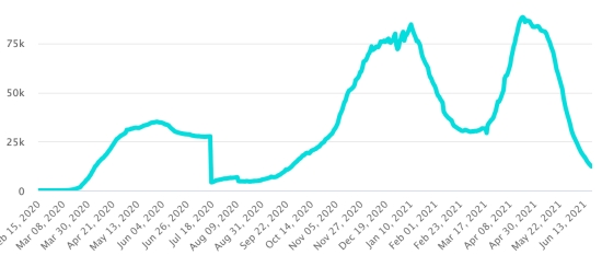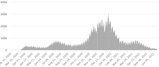Vaccination: 2.62 billion doses of vaccine injected (+30 million doses injected in 24 hours updated June 19, 2021 latest data available). 1 TOP 5 countries with the most active cases: (less deaths and recoveries) 1st - USA: 5,089,786 cases, (-10,634 in 24 hours), the day before (-19,293) 2nd * - Brazil: 1,199,033 cases (+32,446 in 24 hours), the day before (+36,201) 3rd * - India: 729,216 cases (-30,773 in 24 hours), the day before (-38,636) 4th * - Russia 317,493 cases (+8,532 in 24 hours), the day before (+6,756) advance by one place 5th * - Argentina 301,547 cases (-8,640 in 24 hours), the day before (+6,078) TOP 5 countries with the most deaths: 1st - USA: 617,083 deaths (+163 in 24 hours), the day before (+480) 2nd * - Brazil: 500,868 deaths (+2,247 in 24 hours), the day before (+2,449) 3rd * - India: 386,740 deaths (+1,573 in 24 hours), the day before (+1,646) 4th * - Mexico: 231,151 deaths (+192 in 24 hours), the day before (+167) 5th * - Peru: 190,202 deaths (+269 in 24 hours), the day before (+176) TOP 5 countries with the highest number of healings: 1st * - India: 28,766,009 healings (+87,619 in 24 hours), cure rate 96.26% (+) 2nd - USA: 28,694,843 healings (+18,914 in 24 hours), cure rate 83.41% (+) 3rd * - Brazil: 16,183,849 healings (+46,881 in 24h), cure rate 90.49% (-) 4th * - France: 5,555,411 healings (+8,485 in 24 hours), cure rate 96.52% (+) 5th * - Turkey: 5,228,419 healings (+4,195 in 24 hours), cure rate 97.45% (-) DIASPORA: United States: * Case since the first case (March 9, 2020): 34,401,712 cases (+8,443 in 24 hours), the day before (+15,677) * Healings: 28,694,843 healings (+18,914 in 24 hours), the day before (+34,490) National Healing Rate: 83.41% (+) * Death: 617,083 deaths (+163 in 24 hours), the day before (+480) * Active cases (less deaths and recoveries): 5,089,786 cases, (-10,634 in 24 hours), the day before (-19,293) Canada: * Cases since the start of the epidemic (January 25, 2020): 1,408,123 cases (+854 in 24 hours), the day before (+1,016) * Healings: 1,369,844 people (+1,395 in 24 hours, the day before (+1,652) National Healing Rate: 97.28% (+) * Death: 26,054 deaths (+31 in 24 hours), the day before (+11) National death rate: 1.85% (-) * Active cases: (excluding death and cures) 12,225 (-572 in 24 hours), the day before (-647) * Tests: 36,104,847 people tested since the first case. Vaccination: 31.84 million doses of vaccine injected since December 14, 2020, date of the first injection in Canada (+420,000 doses injected in 24 hours updated June 19, 2021 latest data available). Canada: Number of daily confirmed active cases (less deaths and recoveries)