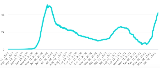 France: * Cases confirmed since the first case (January 24, 2020): 5,755,496 cases (+2,624 cases in 24 hours), the day before (+2,044) * Healings: 5,555,411 healings (+8,485 in 24 hours), the day before (+10,607) National Healing Rate: 96.52% (+) Deaths: 110,724 deaths (+22 in 24 hours in hospitals), the day before in total, (+68) * Active cases: (excluding death and cures) 89,361 (-5,883 in 24 hours), the day before (-7,494) Latin America and the Caribbean active cases (less deaths and recoveries): * Brazil: 1,199,033 cases (+32,446 in 24 hours), the day before (+36,201) * Argentina: 301,547 cases (-8,640 in 24 hours), the day before (-6,078) * Mexico: 275,417 cases (+1,337 in 24 hours), the day before (+1,529) * Colombia: 173,726 cases (+538 in 24 hours), the day before (+1,415) * Peru: 171,080 cases (unavailable since June 3), the day before (unavailable) Dominican Republic: 55,027 cases (+1,612 in 24 hours) the day before (+344) * Chile: 40,701 cases (-1,526 in 24 hours), the day before (+1,411) * Jamaica: 20,111 cases (-92 in 24 hours), the day before (-95) * Ecuador: 16,790 cases (+1,141 in 24 hours), the day before (+1,995) advances 2 places * French Guiana: 16,318 cases (unavailable), the day before (+306 in 48 hours) * Guadeloupe: 14,273 cases (unavailable 3rd day), the day before (unavailable) * Martinique: 11,982 cases (Unavailable 4th day), the day before (unavailable) * Panama: 10,461 cases (+247 in 24 hours), the day before (+185) * Cuba: 7,935 cases (+131 in 48 hours), the day before (+6 in 48 hours) Haiti: 4,221 cases (+154 in 24 hours), the day before (+83 in 24 hours) * Bahamas: 824 cases (+30 in 72h), the day before (unavailable) HAITI: Epidemiological situation: Warning: The Ministry of Public Health and Population (MSPP) did not make available after June 15, 2021 daily data on the situation of Covid-19 in Haiti As a result , the information below on the situation in Haiti is the latest data available . According to the Ministry of Public Health, 191 new cases in 24 hours of Covid-19 and its Alpha and Gamma variants were confirmed in Haiti on June 15, 2021 (latest data partial available) for a total of 17,239 cases confirmed throughout the national territory since the first case (March 19, 2020 https://www.haitilibre.com/en/news-30319-haiti-health-origin-of-the-first-2-cases-of-covid-19-in-haiti.htmll). Last update (189 cases in 48 hours, June 13 and 14, 2021). Healings: 12,645 people (+33 in 24 hours) Healing rate: 73.35% (-) Deaths: 373 deaths +4 in 24 hours) Mortality rate: 2.16% (=) Haiti: Number of daily death cases: