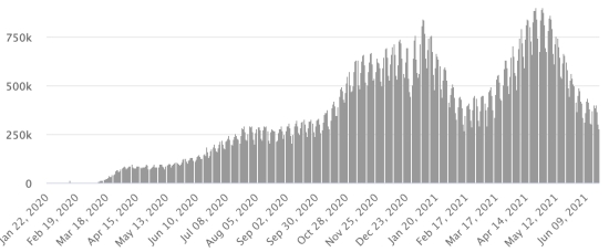 Vaccination: 2.66 billion doses of vaccine injected (+40 million doses injected in 24 hours updated June 20, 2021 latest data available). 1 TOP 5 countries with the most active cases: (less deaths and recoveries) 1st - USA: 5,034,868 cases, (-42,652 in 24 hours), the day before (-12,266) 2nd * - Brazil: 1,178,597 cases (-27,175 in 24 hours), the day before (+6,739) 3rd * - India: 662,521 cases (-40,337 in 24 hours), the day before (-26,358) 4th * - Russia 331,122 cases (+13,629 in 48 hours), the day before (unavailable) 5th * - Argentina 277,070 cases (-12,463 in 24 hours), the day before (-12,014) TOP 5 countries with the most deaths: 1st - USA: 617,463 deaths (+297 in 24 hours), the day before (+83) 2nd * - Brazil: 502,817 deaths (+899 in 24 hours), the day before (+1,050) 3rd * - India: 389,302 deaths (+1,138 in 24 hours), the day before (+1,424) 4th * - Mexico: 231,244 deaths (+57 in 24 hours), the day before (+36) 5th * - Peru: 190,645 deaths (+220 in 24 hours), the day before (+223) TOP 5 countries with the highest number of healings: 1st * - India: 28,926,038 healings (+81,839 in 24h), cure rate 96.49% (+) 2nd - USA: 28,767,507 cures (+56,192 in 24 hours), cure rate 83.57% (+) 3rd * - Brazil: 16,288,392 healings (+68,154 in 24 hours), cure rate 90.64% (+) 4th * - France: 5,566,434 healings (+9,834 in 24 hours), cure rate 96.67% (+) 5th * - Turkey: 5,237,731 healings (+5,093 in 24 hours), cure rate 97.43% (=) DIASPORA: United States: * Case since the first case (March 9, 2020): 34,419,838 cases (+13,837 in 24 hours), the day before (+4,289) * Healings: 28,767,507 healings (+56,192 in 24 hours), the day before (+16,472) National Healing Rate: 83.57% (+) * Death: 617,463 deaths (+297 in 24 hours), the day before (+83) * Active cases (less deaths and recoveries): 5,034,868 cases, (-42,652 in 24 hours), the day before (-12,266) Canada: * Cases since the start of the epidemic (January 25, 2020): 1,409,607 cases (+771 in 24 hours), the day before (+713) * Healings: 1,372,491 people (+1,491 in 24 hours, the day before (+1,156) National Healing Rate: 97.36% (+) * Death: 26,084 deaths (+8 in 24 hours), the day before (+22) National death rate: 1.85% (=) * Active cases: (excluding death and recovery) 11,032 (-728 in 24 hours), the day before (-465) * Tests: 36,243,642 people tested since the first case. Vaccination: 32.19 million doses of vaccine injected since December 14, 2020, date of the first injection in Canada (+350,000 doses injected in 24 hours updated June 20, 2021 latest data available). Canada: Number of daily confirmed cases
